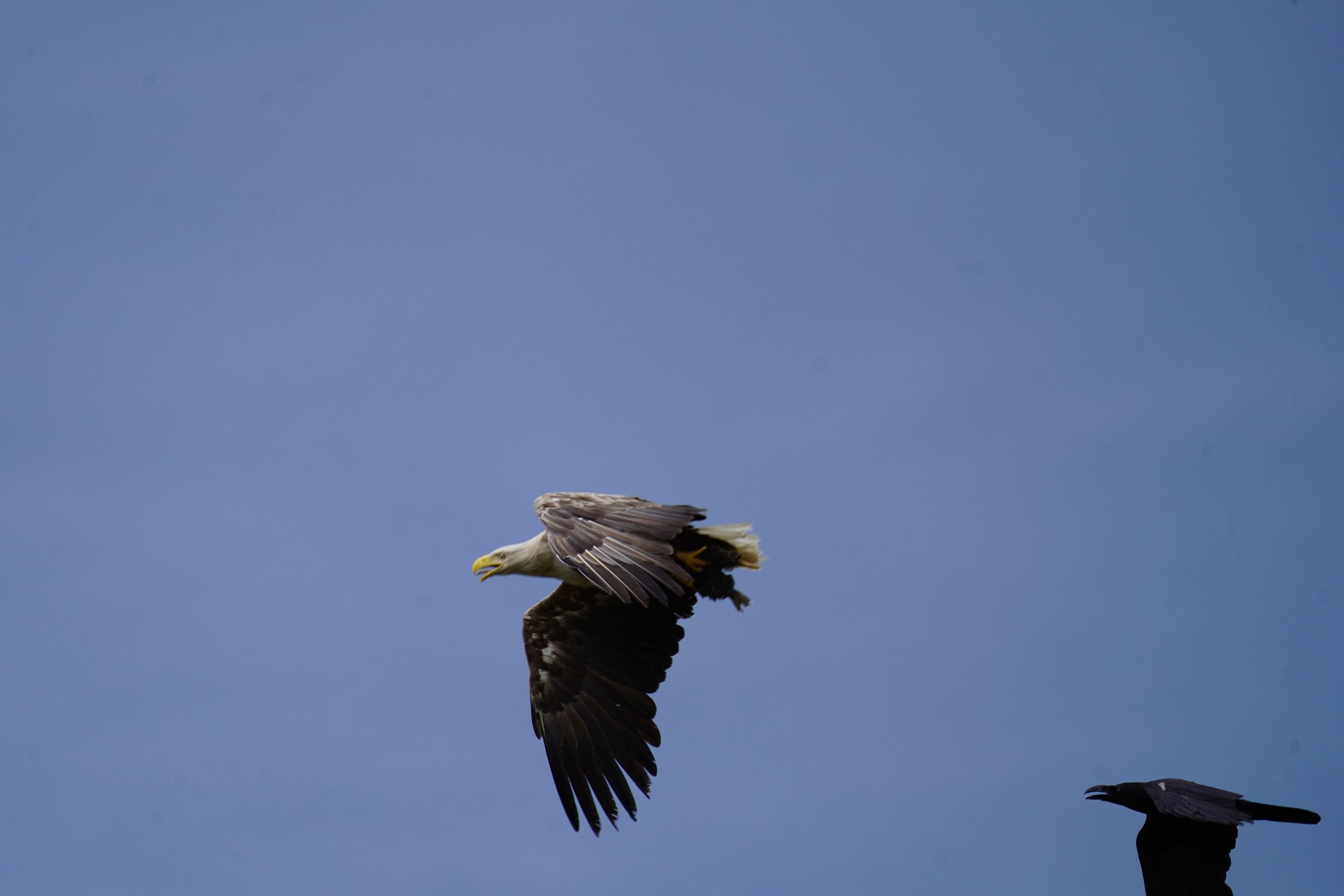 海岸を歩いていると上空が騒がしいので見上げると7,8のカラスの群れが。先頭の頭が白っぽかったのでよく見るとオジロワシでカラスにモビングされていた。足には獲物の魚が、何とかカラスを振り切って去って行った。数日前にもトビがモビングされて魚を落としてしまうシーンを目撃したばかり。