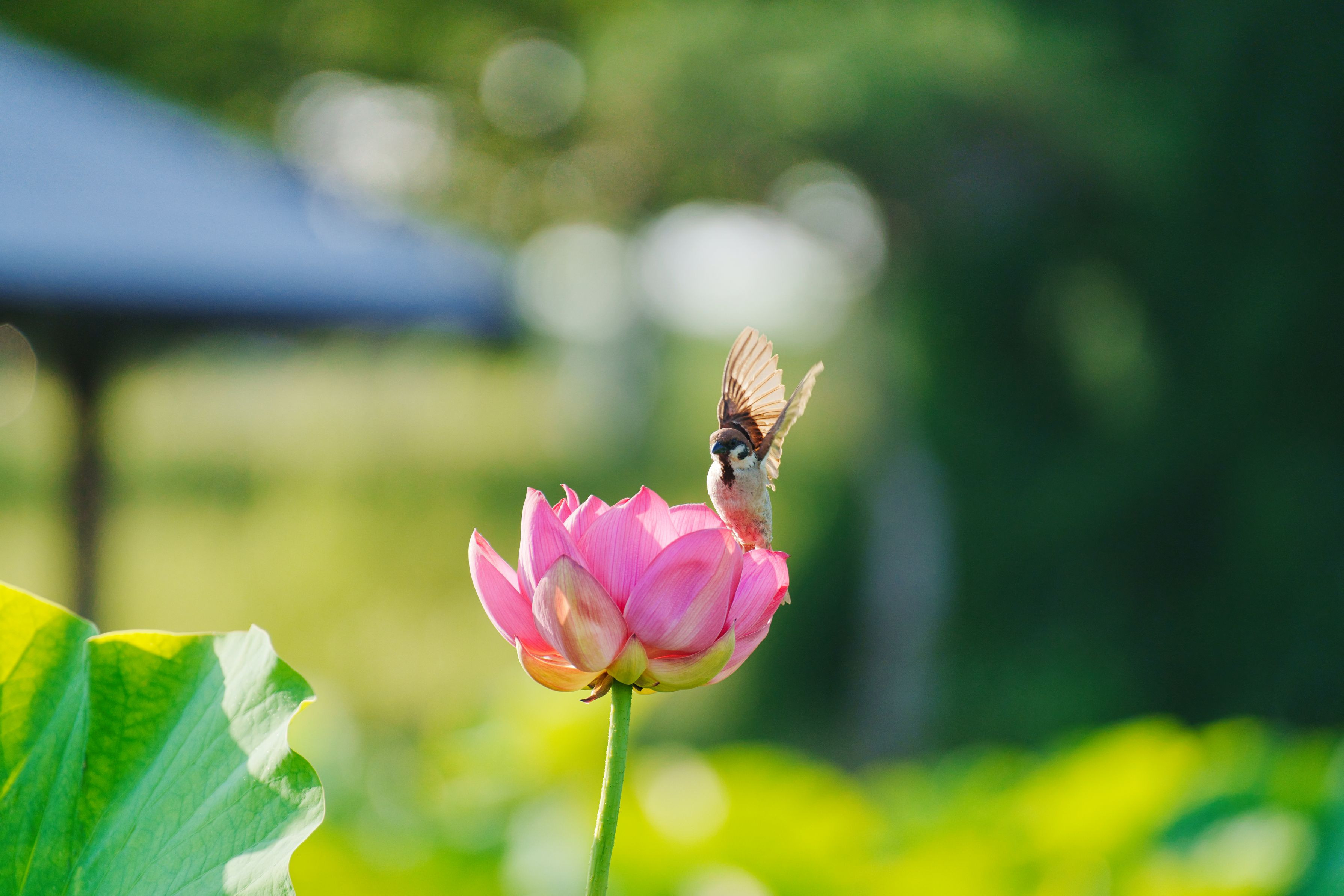蓮の花にふわりと降りたすずめ