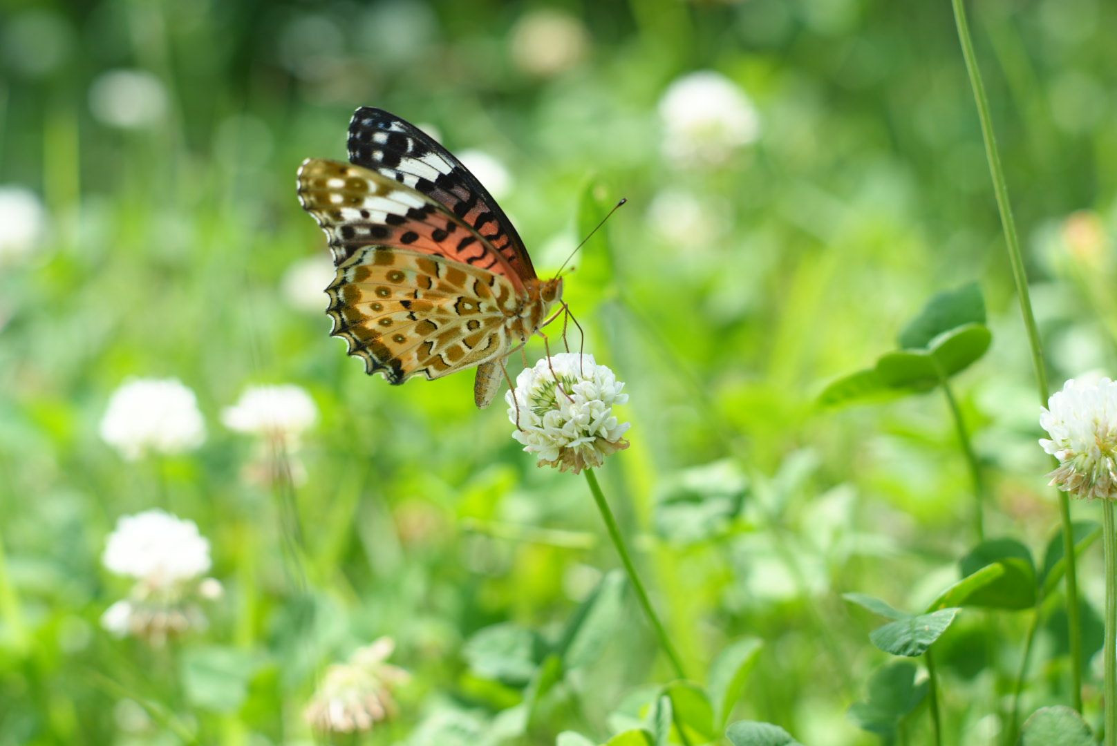 シロツメクサでツマグロヒョウモンが食事中です。 50mm F2 の絞り優先で撮影しました。