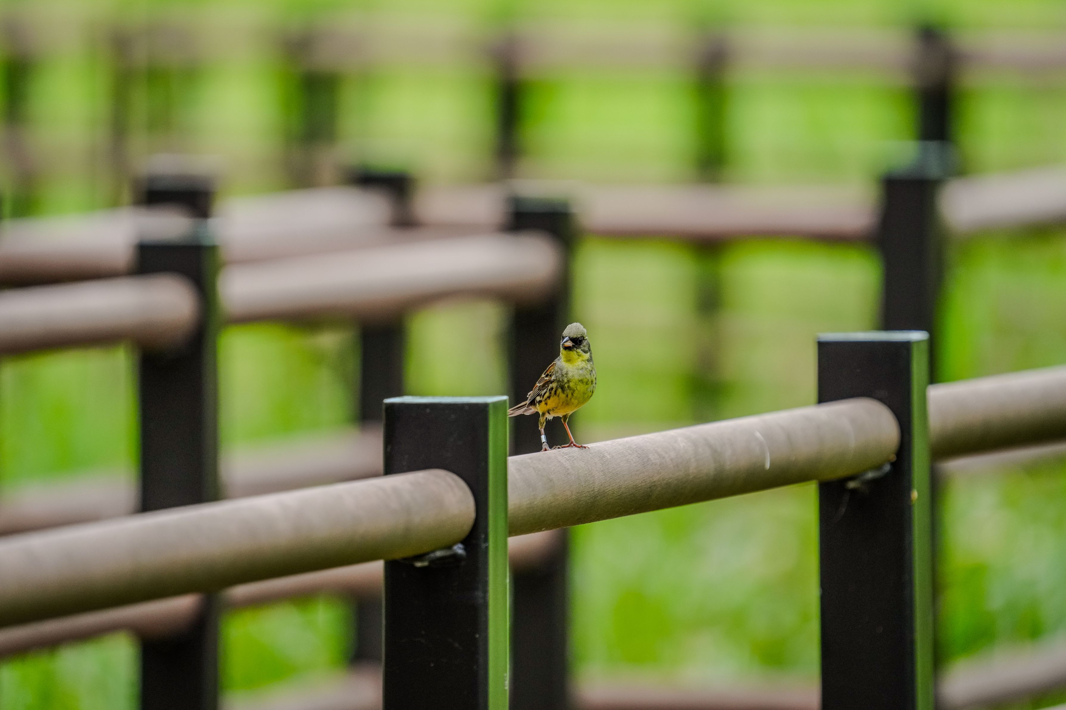 かわいい声に似合わない厳つい顔。新緑の葉っぱに紛れると判別に難渋する。 ウグイスと追いかけっこしてたときに、偶々欄干に止まったところをパシャっとしました。帰ってから気づいたんですが、この子足環がついてる。残念ながら文字の判読ができませんでした。