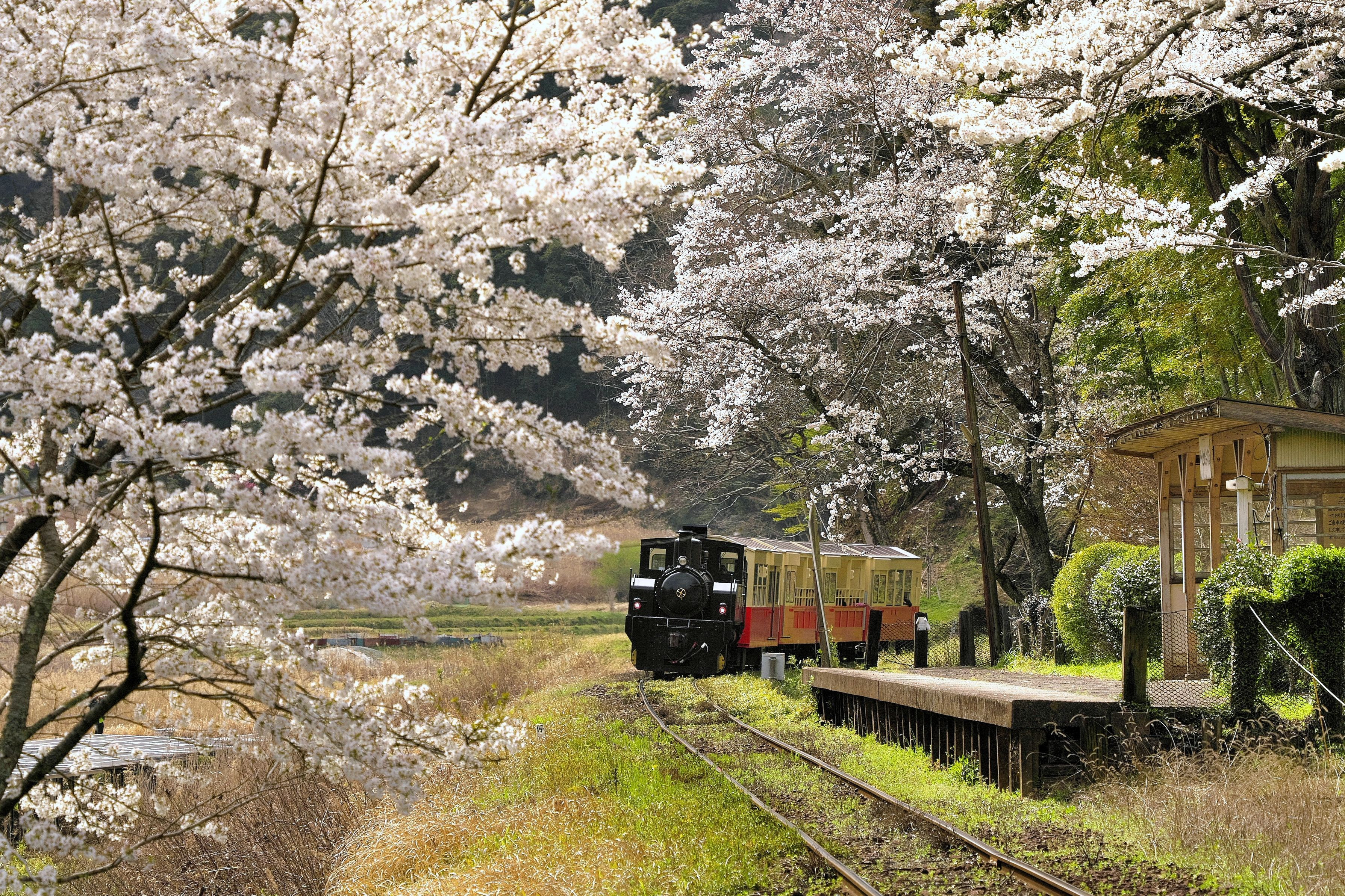 小湊鉄道トロッコ電車を桜とコラボさせました。 右に写っている駅名は忘れました。(夢中で撮った)