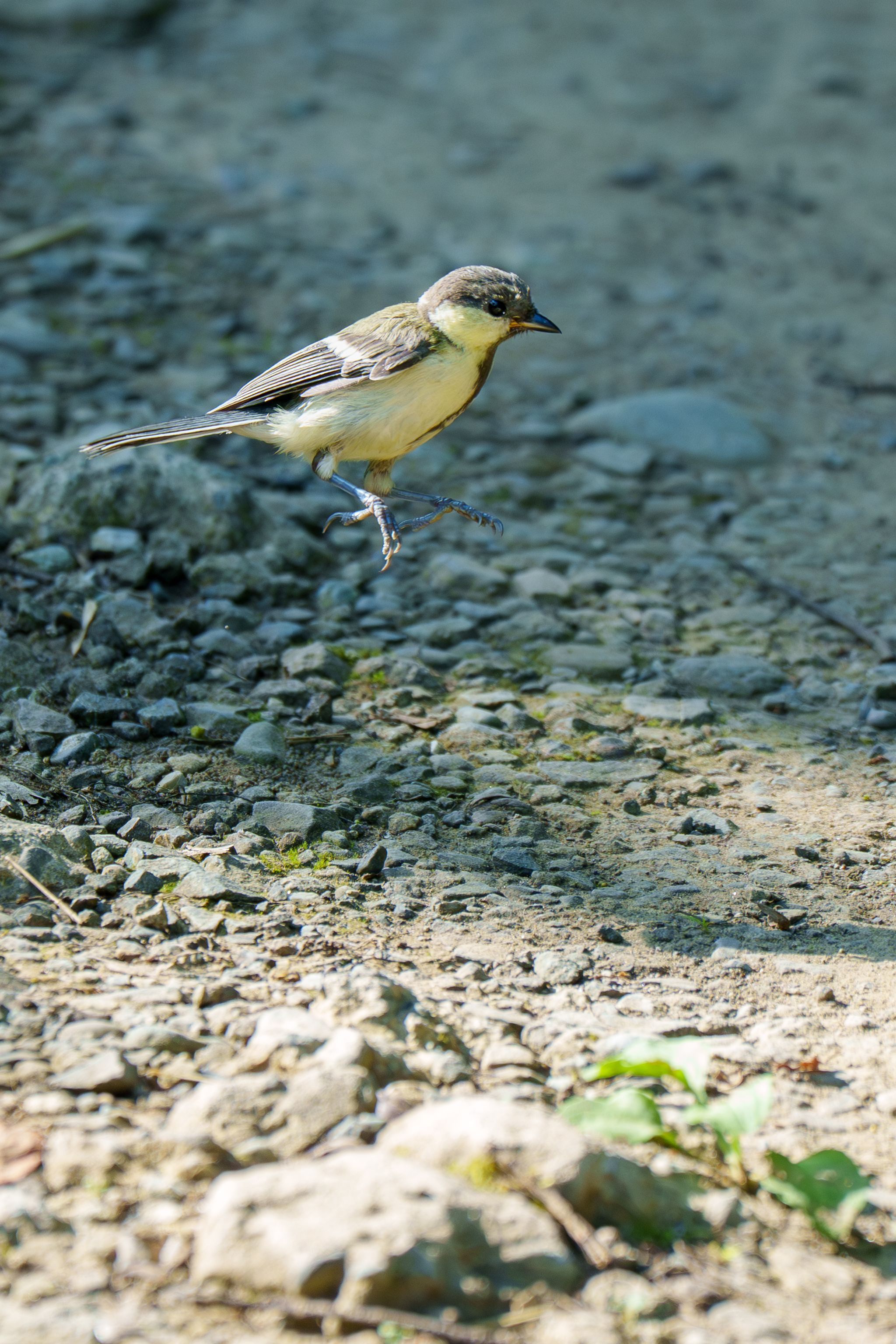 遊歩道に出てきてちょこちょこ餌をついばんでいたシジュウカラが飛ばずにジャンプ!思ったより高いジャンプを見せた場面です。