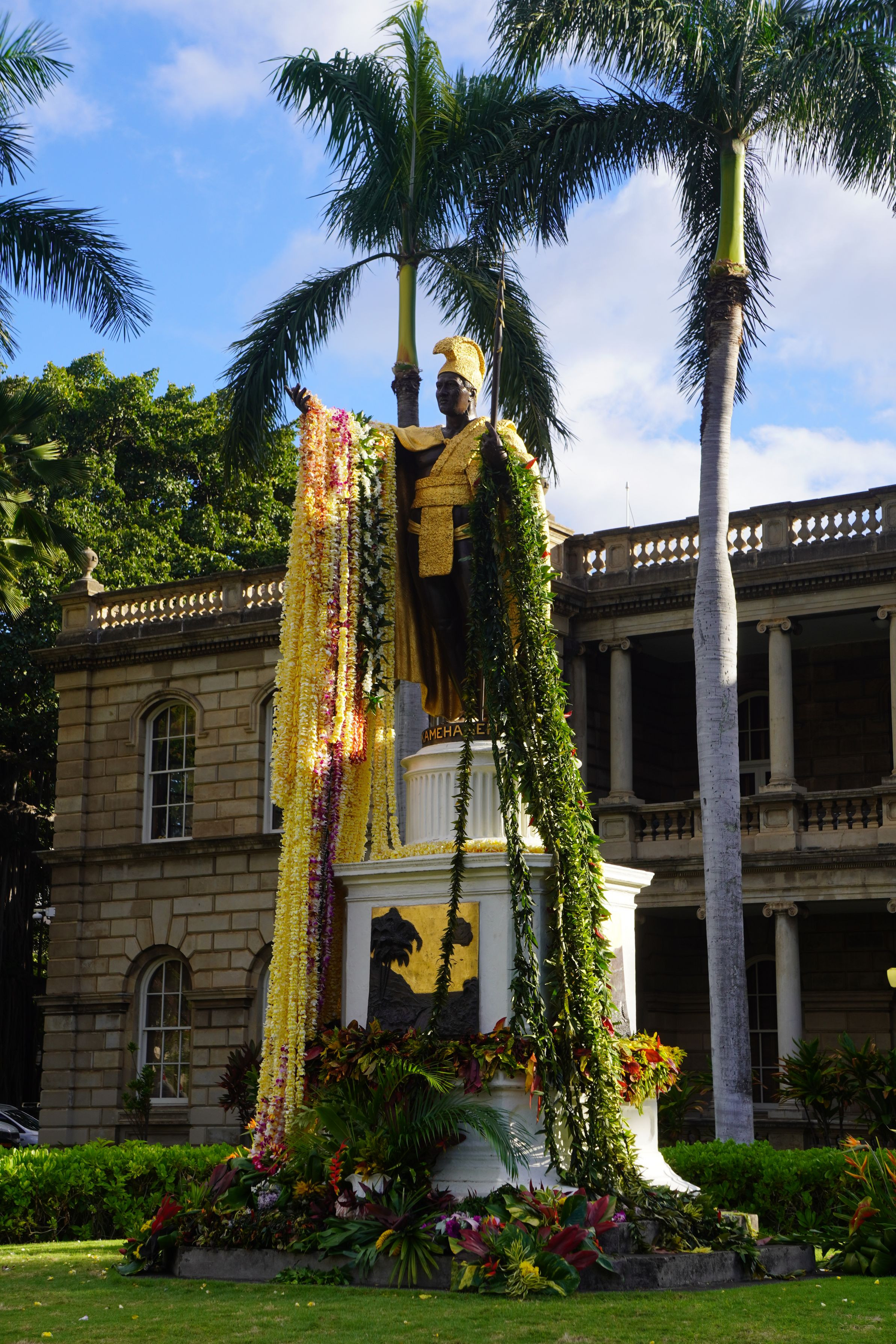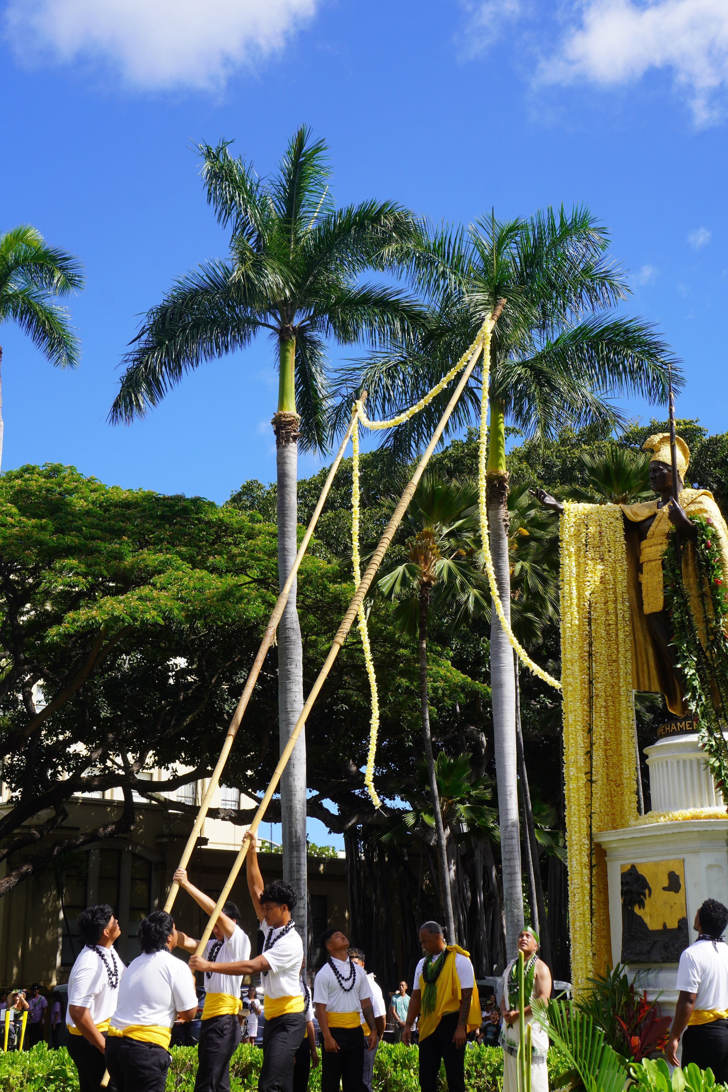イオラニ宮殿の向かい側にはカメハメハ大王の像があります。 6月13日はレイドレーピングの式典がありました。 ものすごく長いレイが像のそばに並べられてよい香りが漂っていました。 そのレイを竿にひっかけて大王の腕にかけていくのですが、風も強く、途中プルメリアがいくつか落ちたりもしていました。 なかなかチャンスがなくて今回初めて見に行くことができました。