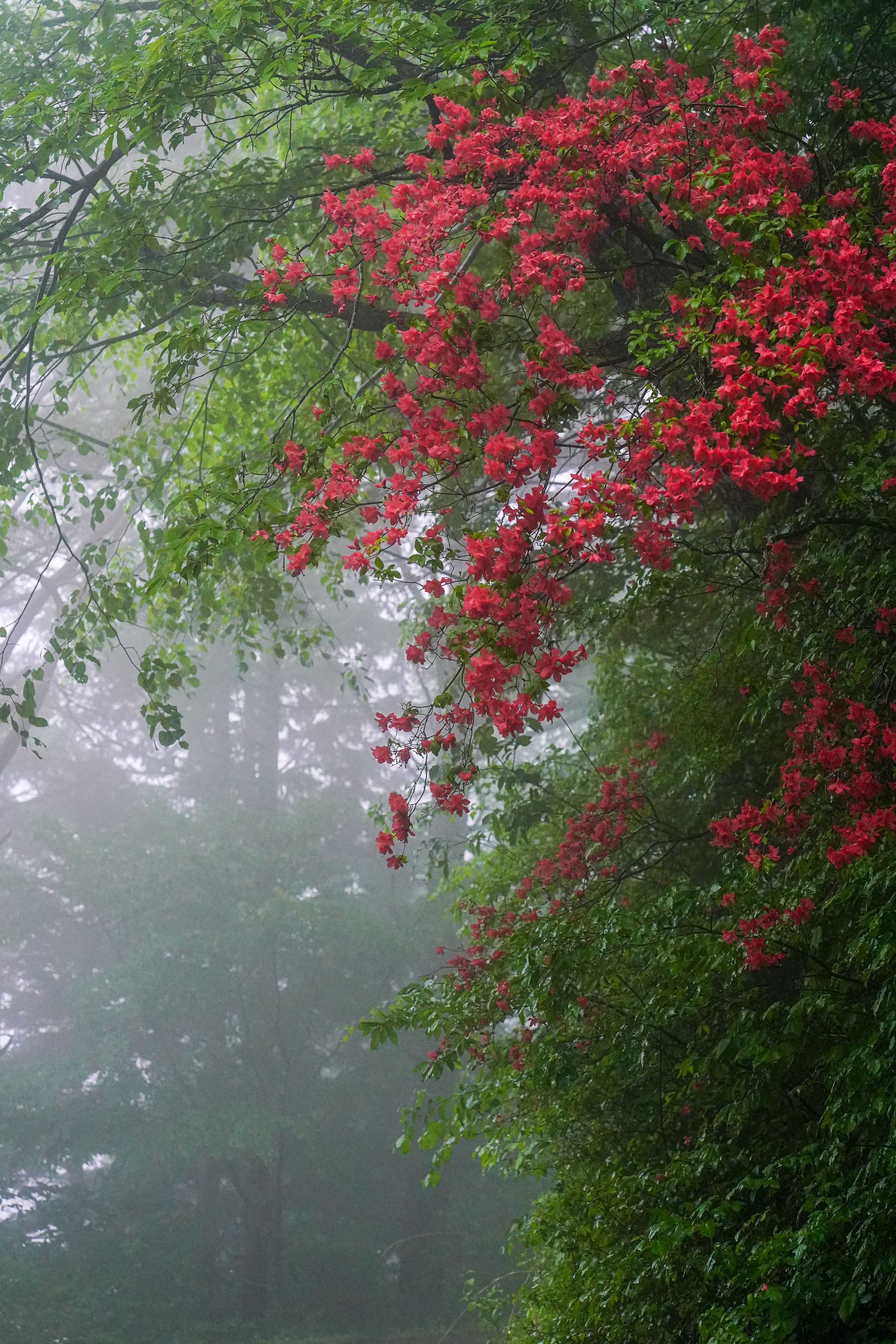 霧の中に山ツツジが浮かんでいるように見えました