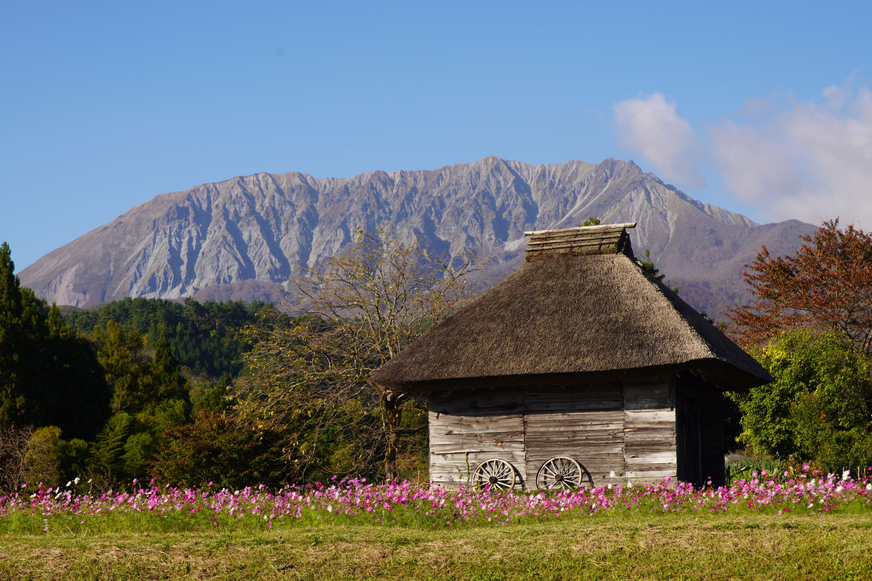 鳥取県江府町大字御机にある知る人ぞ知る大山の撮影スポットです。驚いたことに、google map にも撮影スポットとして載っています。この藁葺き屋根の小屋はここしかないのですが、とっても良い雰囲気を醸し出しています。 カメラを持った人がよくここを訪れます。 令和6年11月3日、ILCE-7RM4 + LA-NE1 + Contax N 24-85 で撮影しました。
