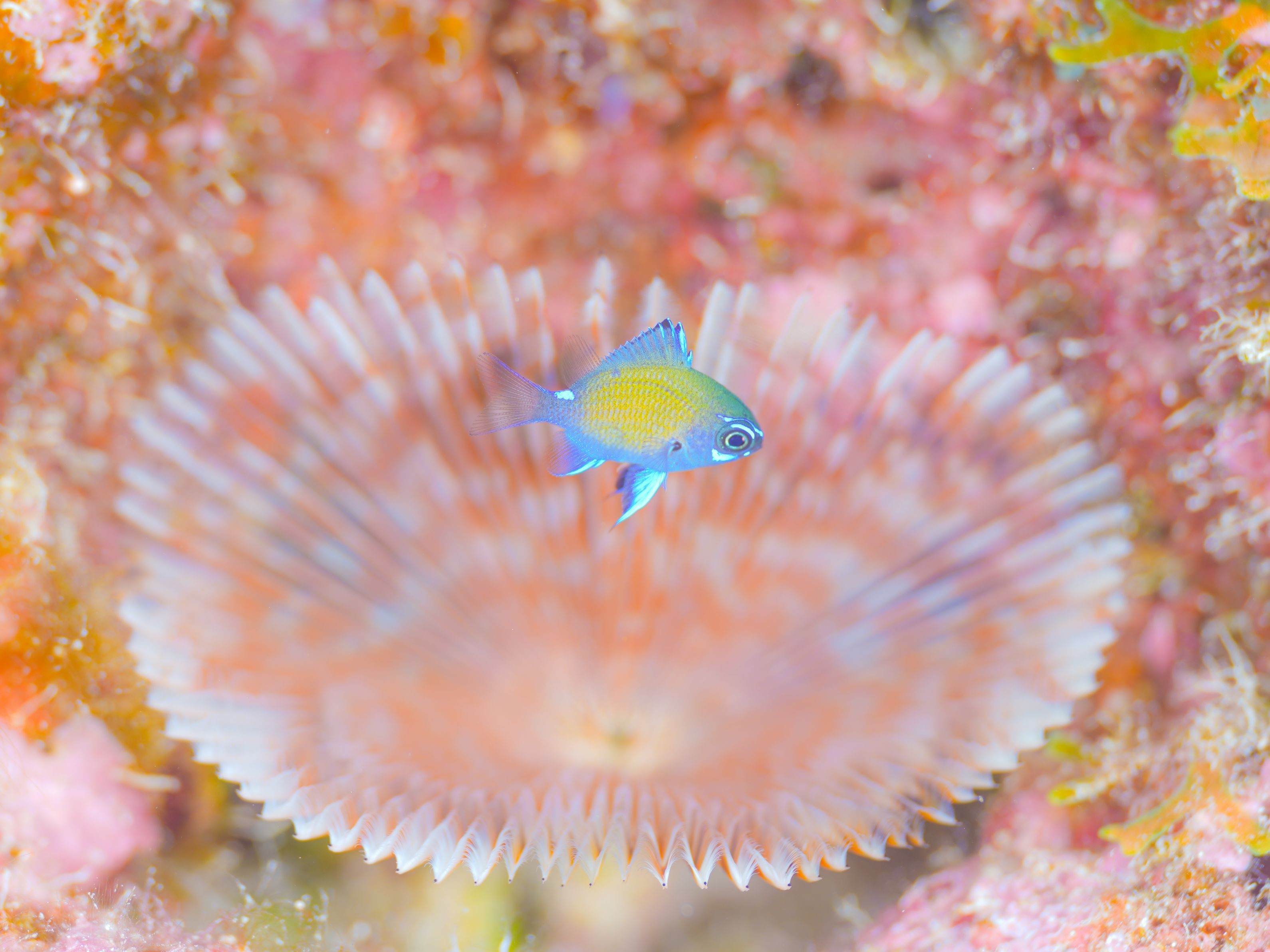 インドケヤリを背景に春と共に現れるアマミスズメダイの幼魚をふんわり撮って見ました
