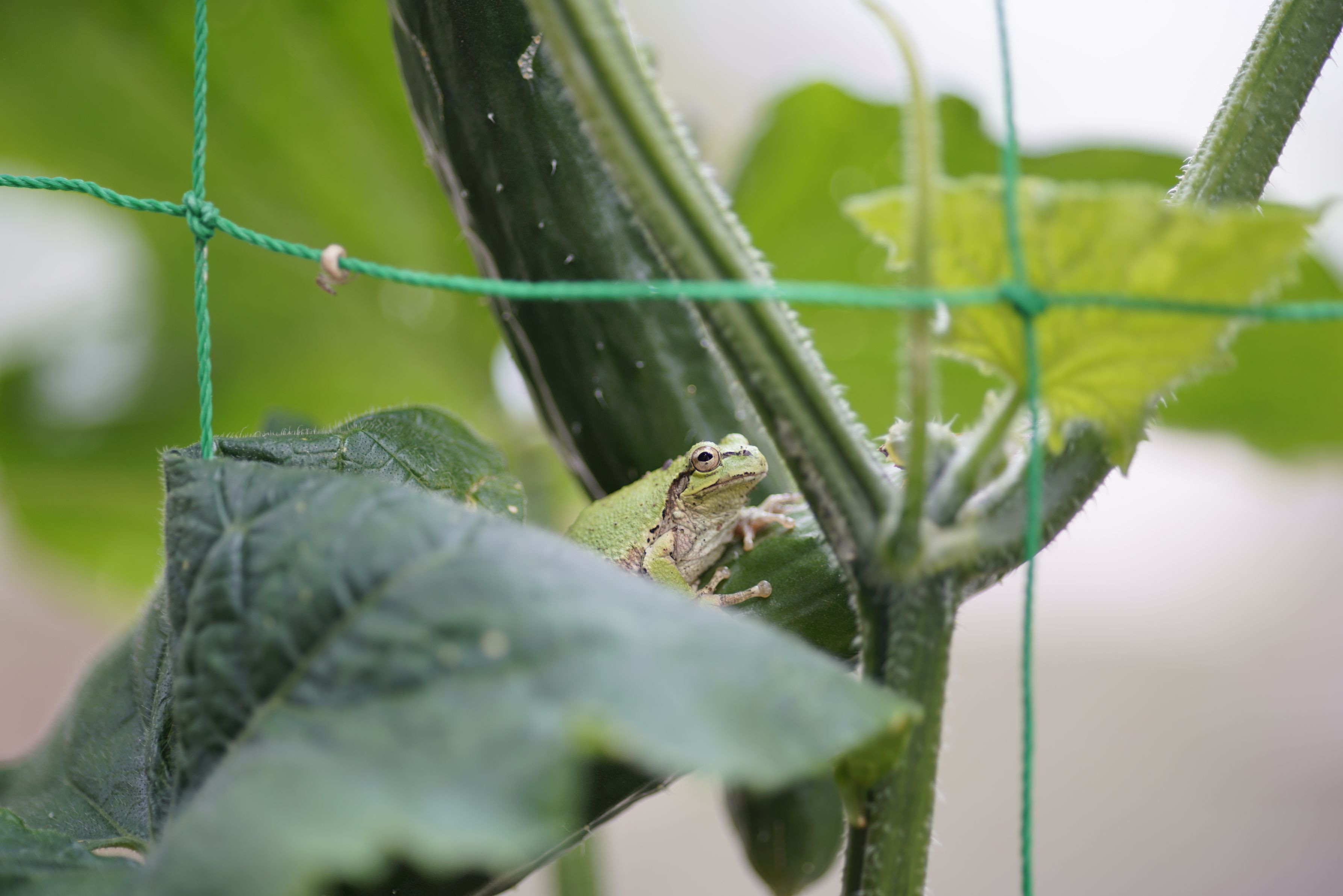 家庭菜園のキュウリ葉の裏にひっそりと隠れていました。