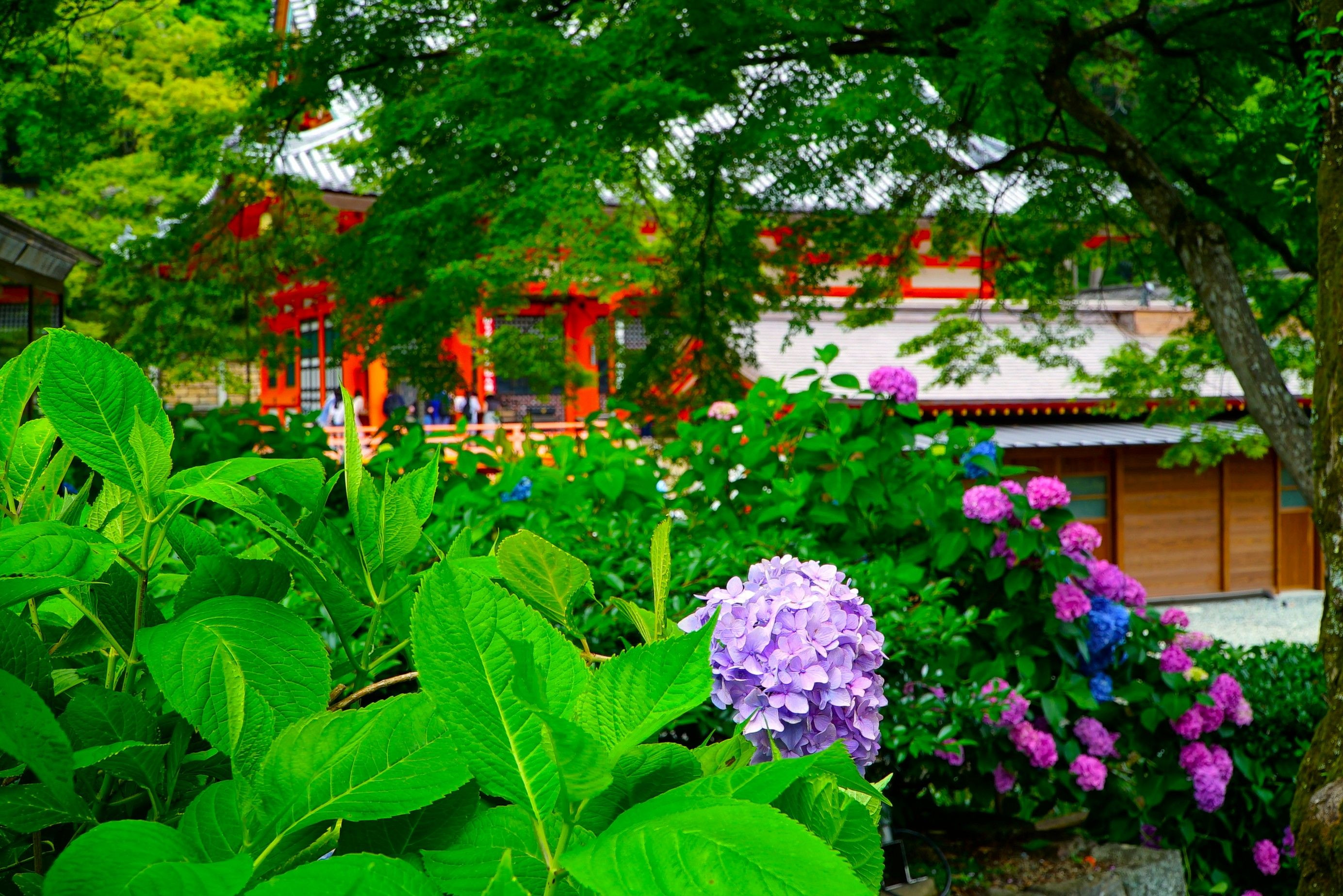製品情報>My Sony>αcafe> 朱色の本堂と  青 紅葉  アジサイ 。(hamadaさん)