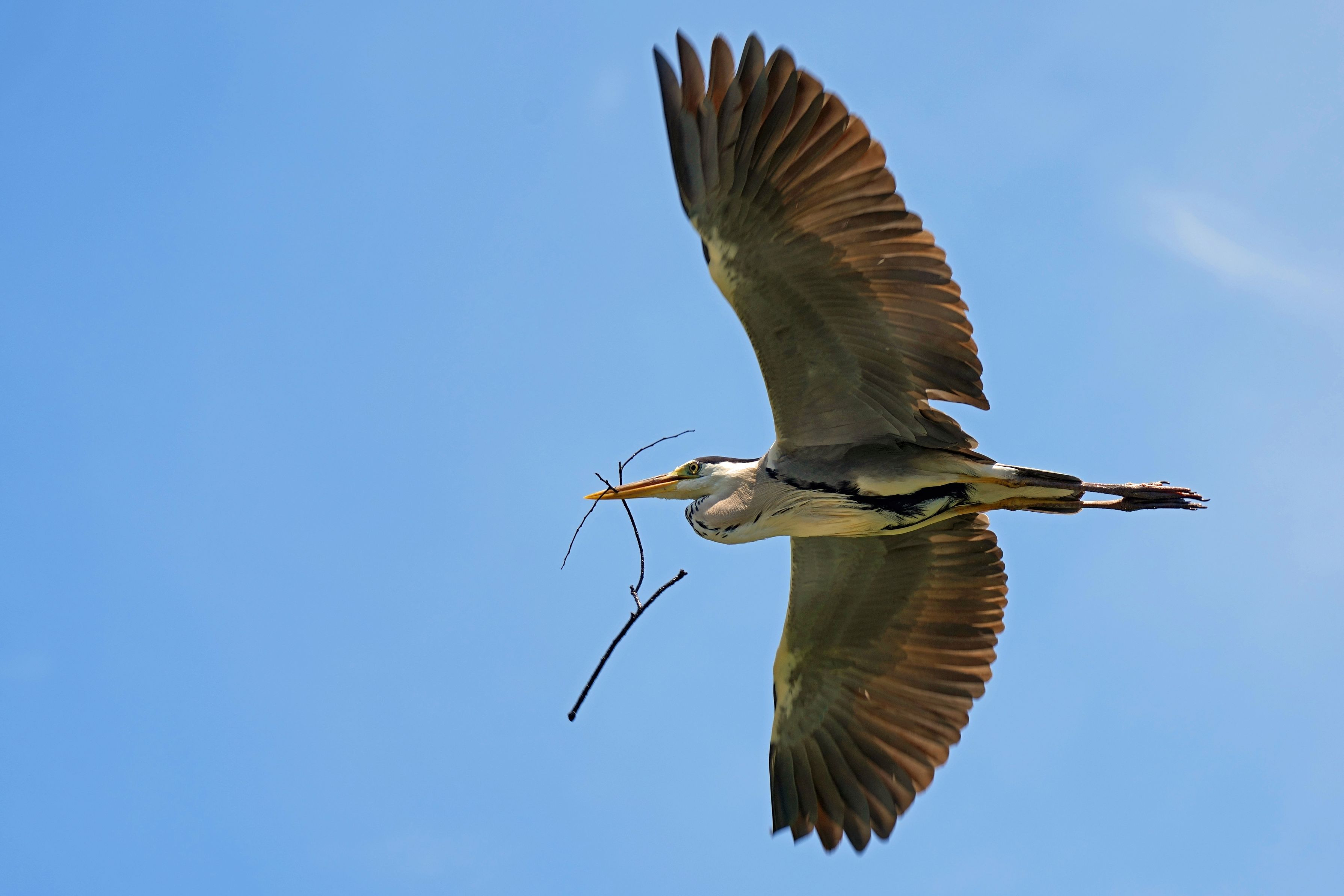 4月~7月はアオサギの繁殖期でもあるので、巣作りのために木の枝をくわえて飛翔する姿を捉えることができました。