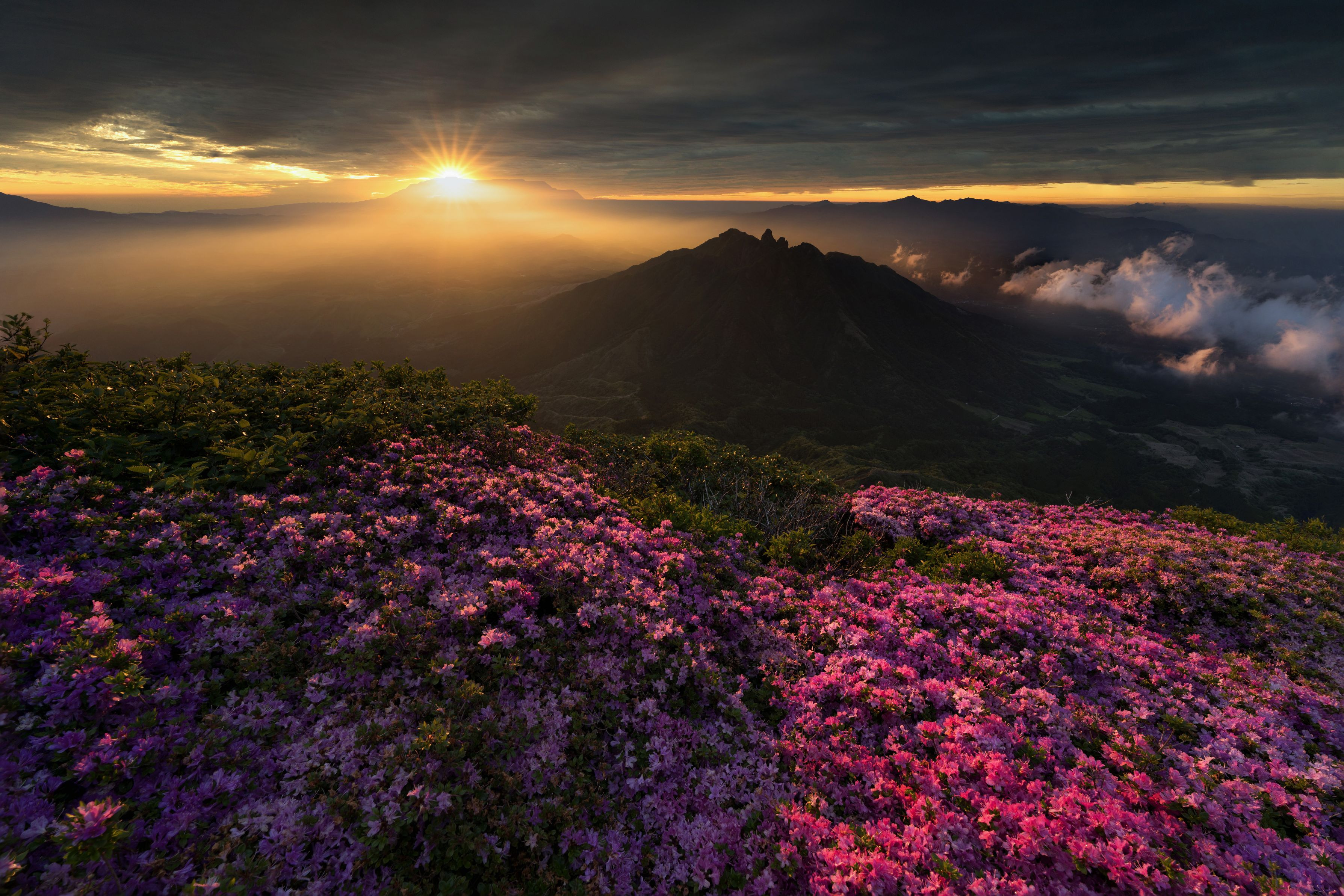 阿蘇高岳東峰から見たご来光です 咲き誇るミヤマキリシマに陽が差し込んだ瞬間 目の前に広がった絶景に息を飲みました