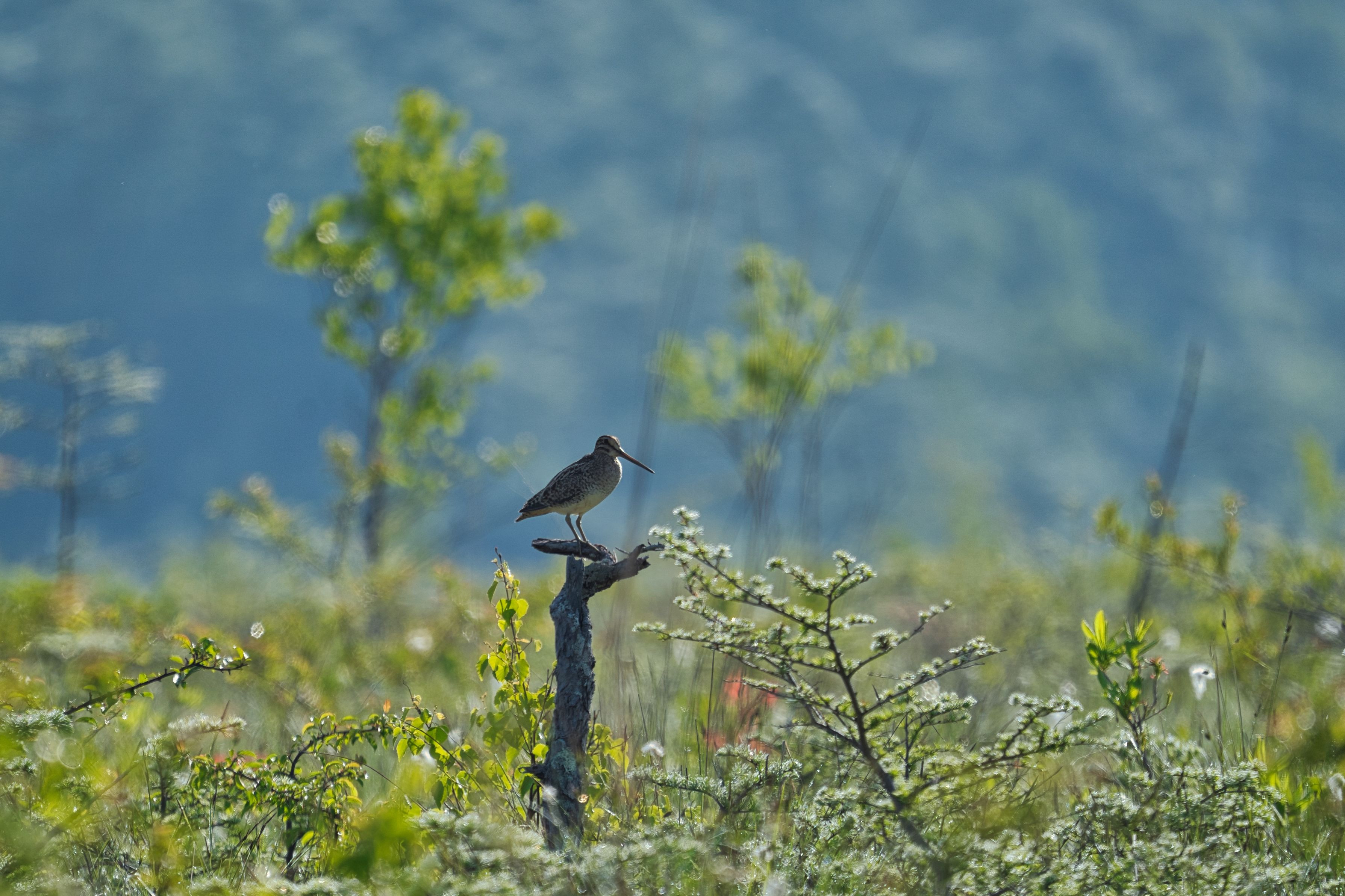 霧が晴れると遮るものがない湿原は一気に気温上昇 強い逆光と激しい陽炎の中に#オオジシギ#の姿が浮かび上がる‼️ 連写して陽炎によるオオジシギの歪みが少ない写真をピックアップ