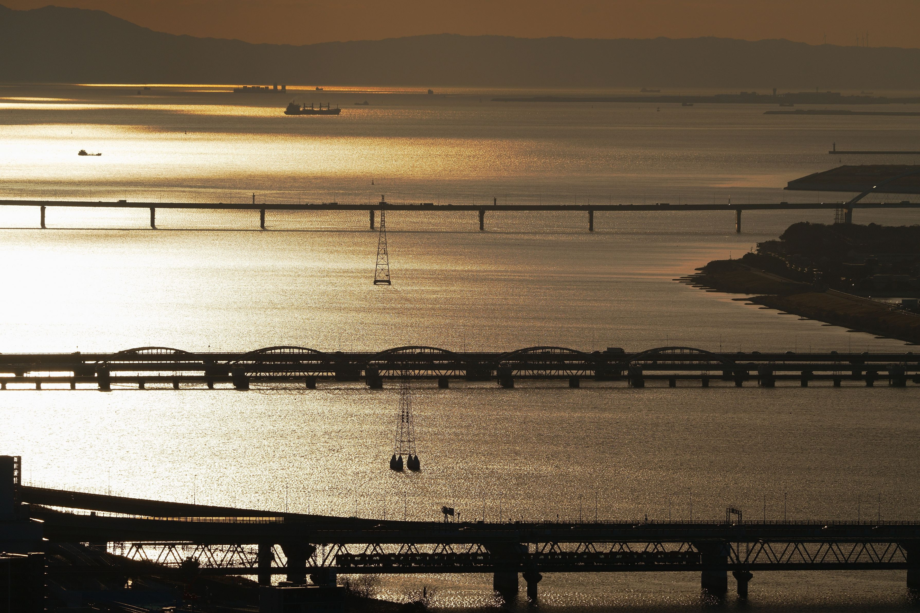 過去撮影の蔵出し 淀川と大阪湾が夕日でキラキラと輝くひととき 鉄橋を渡る阪神電車を添えて