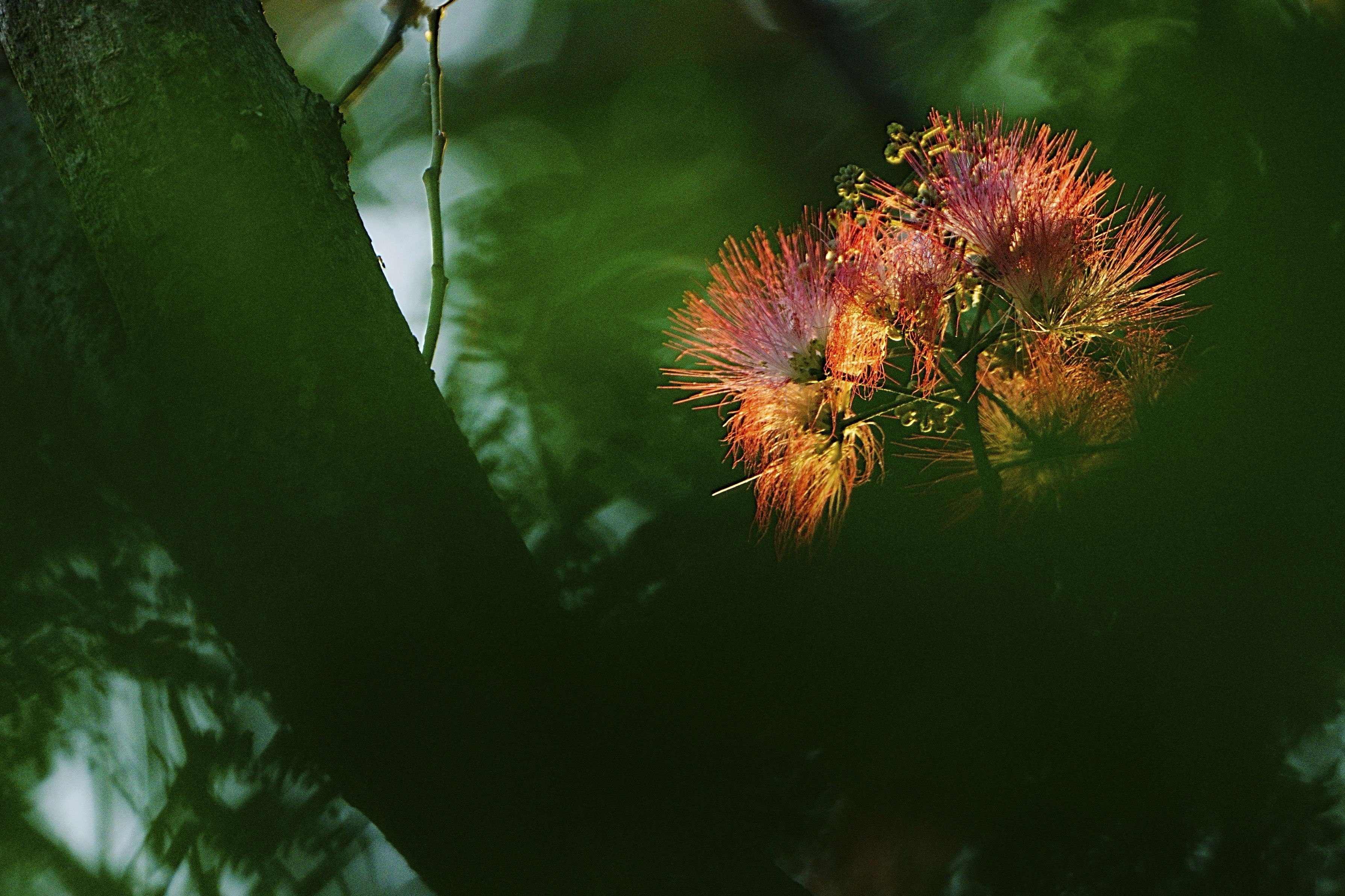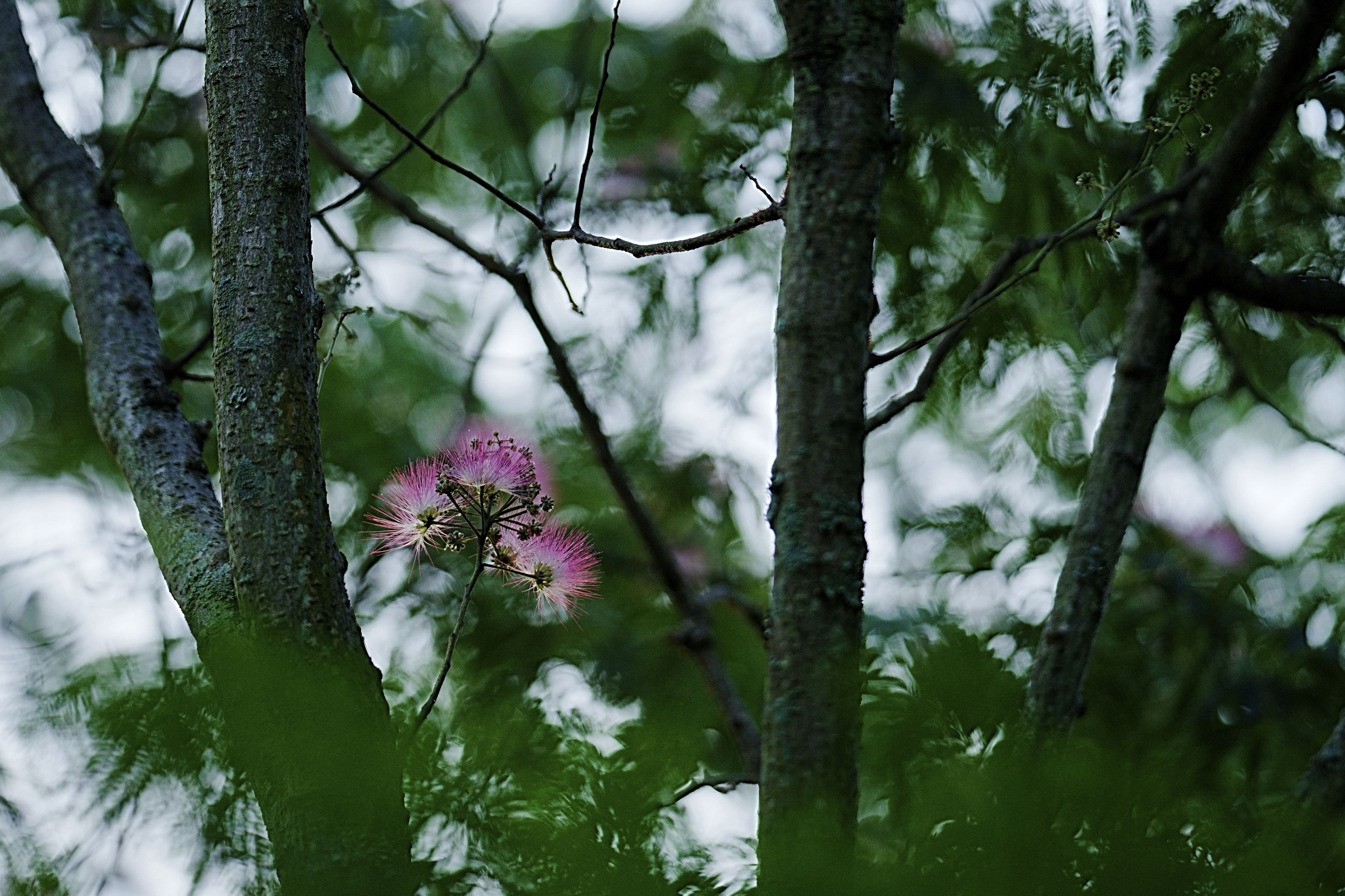 1枚目と同じ場所でレンズを替え、24時間後に再チャレンジしたのが2枚目です。その時、光の当たり方に驚きを持ってシャッターを切りました。が、帰ってPCモニターで見ると咲き終わりが過半数…。1枚目の咲き方で2枚目の条件で撮りたかった…。 以降曇天&雨天が続き、2025ネムノキの季節は終了しました。