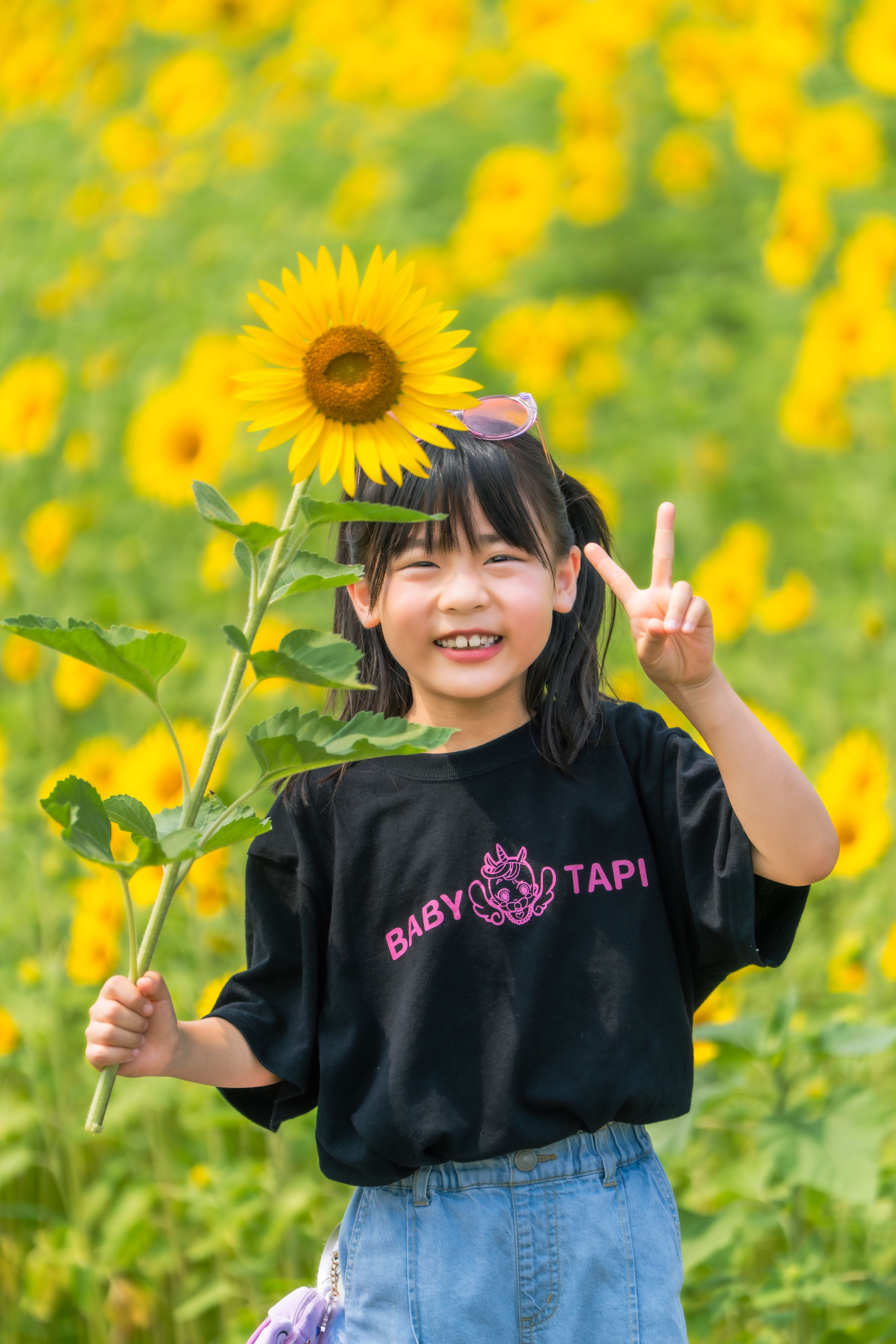 真夏の太陽が照りつける中、ひとりの少女がひまわりを片手にポーズをとってくれました。 若手農家ひまわり畑(@sunflower_official_kochi)の広大なひまわり畑にて、知り合いの娘さんを撮らせてもらいました。※撮影・掲載許可有り