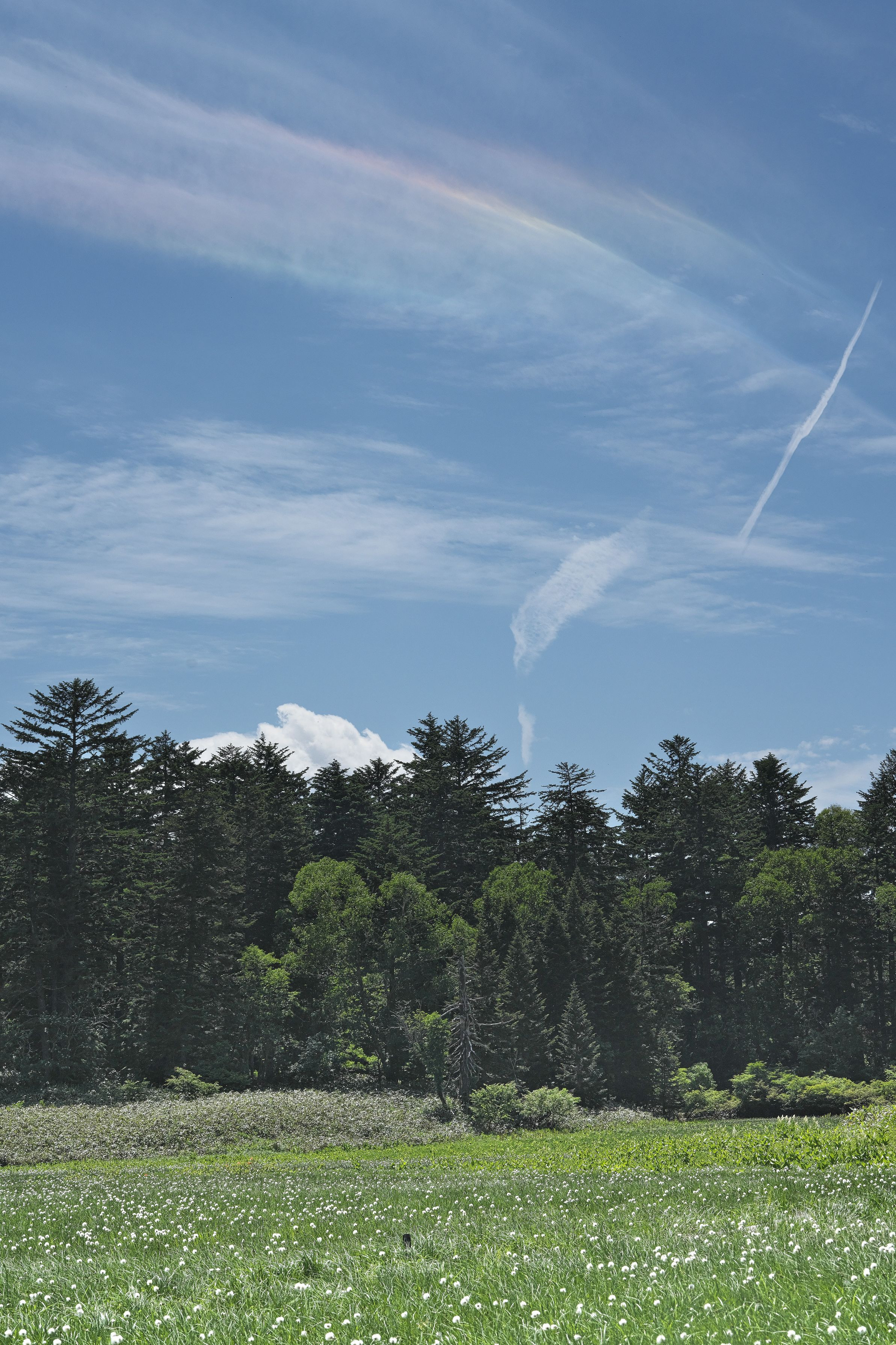6月下旬、尾瀬沼散策中に 他のハイカーの方たちが止まっているので、上空に彩雲が現れているのに気づきました。本当は広角レンズでも撮りたかったのですが、狭い木道の上でバッグを下すこともできず、中望遠のみの写真になりました。
