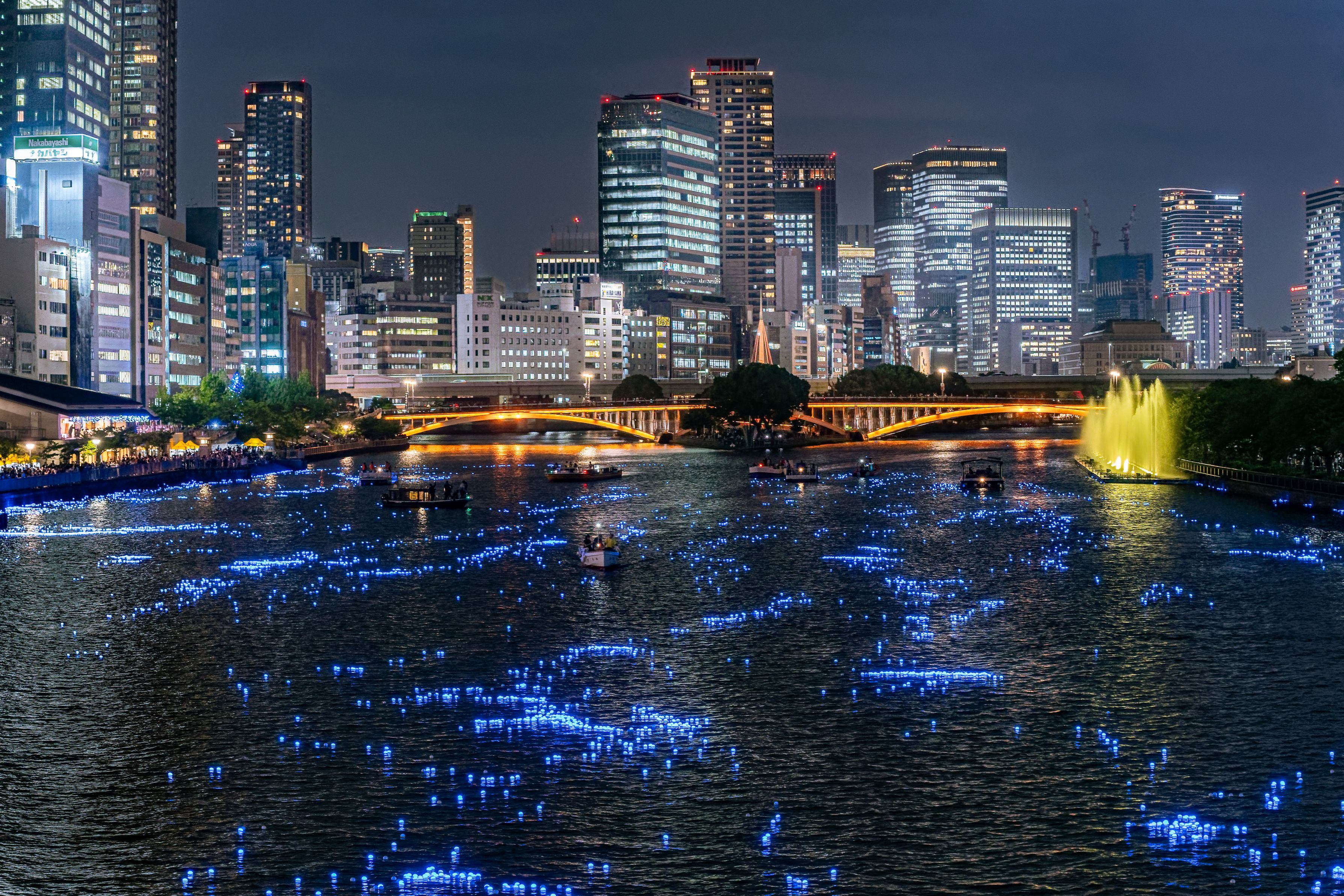 「令和OSAKA天の川伝説」 願いを込めた光る玉を放流し、それはまるで精霊流しのようで、都会の夜景を背に流れる光は天の川のように美しく、心を穏やかにしてくれました。