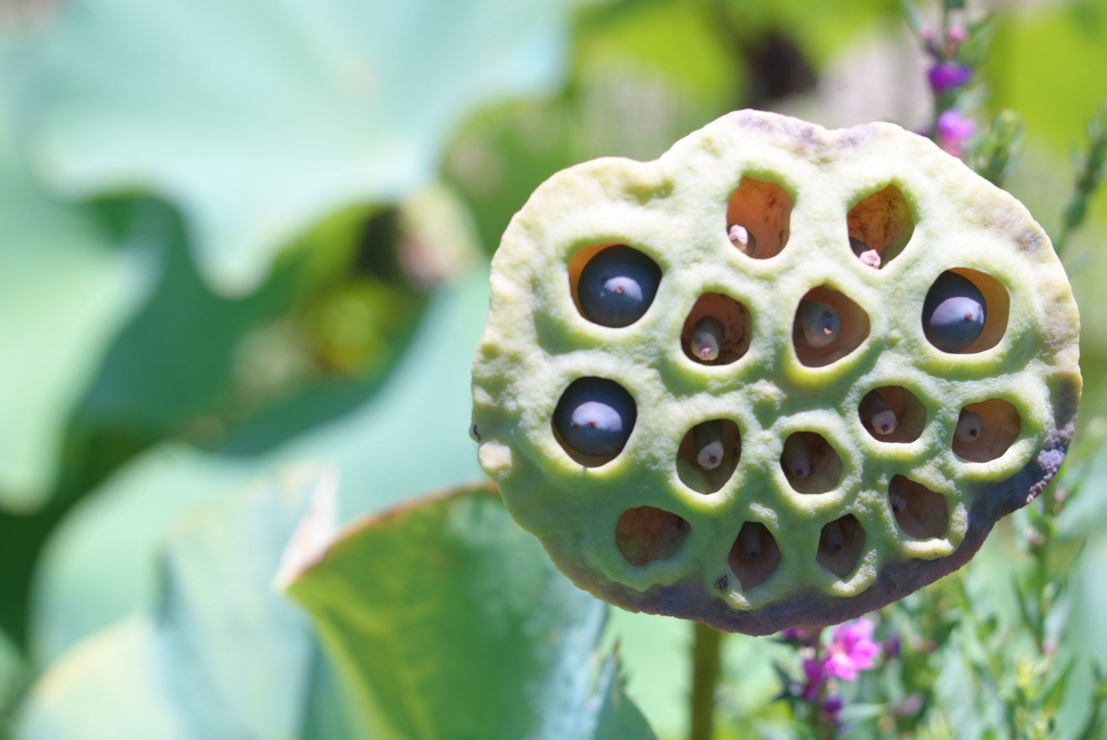 ハスの花托を撮影しました。どんどん種子が出来ているようです。 マクロ65mm F5.6 でマニュアル撮影しました。