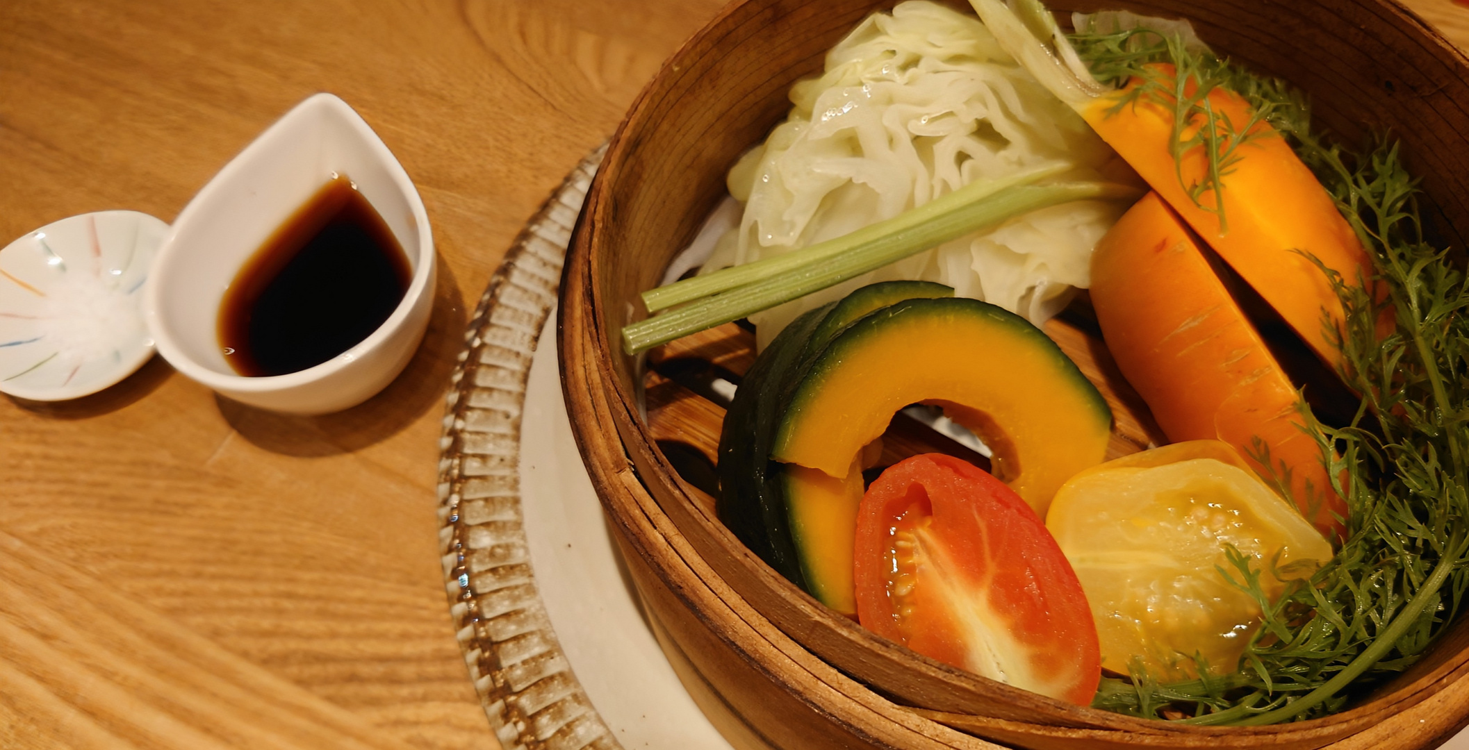 神奈川県の三浦野菜のセイロ蒸しです。三杯酢と雪塩で… 生命力溢れる人参や坊っちゃんカボチャ、キャベツやトマト… 元気が出ます🙂🍀✨