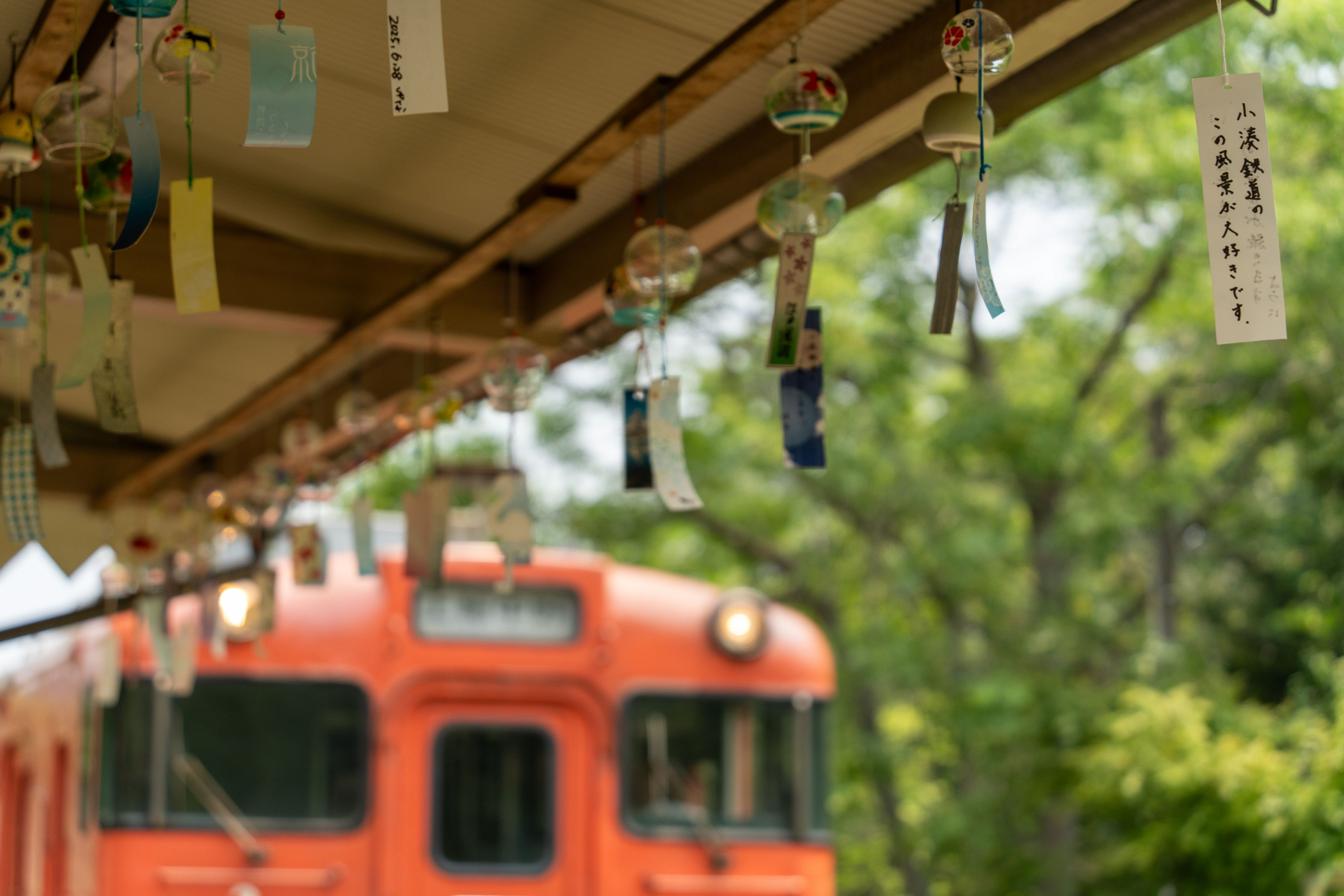 小湊鐡道 月崎駅では夏の風物詩「風鈴」が飾られました。 風鈴の一つに「小湊鐡道のこの風景が大好きです」の短冊が・・・同感です。 ホームを渡る風に揺れて涼しい音を奏でている中、キハ40がやって来ます。