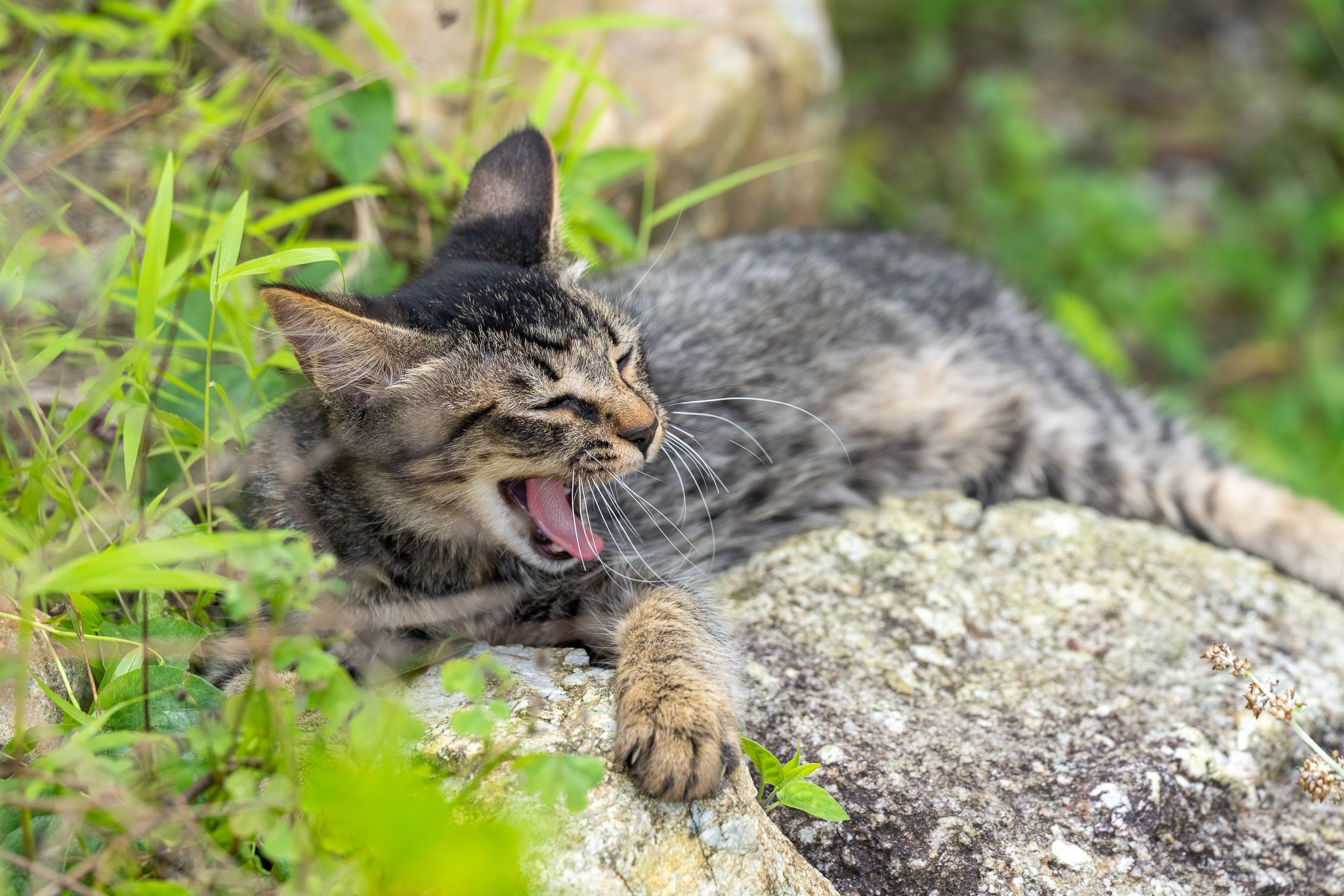 夏の暑さを避けて、日陰の冷たい岩の上でのんびりとあくびをする