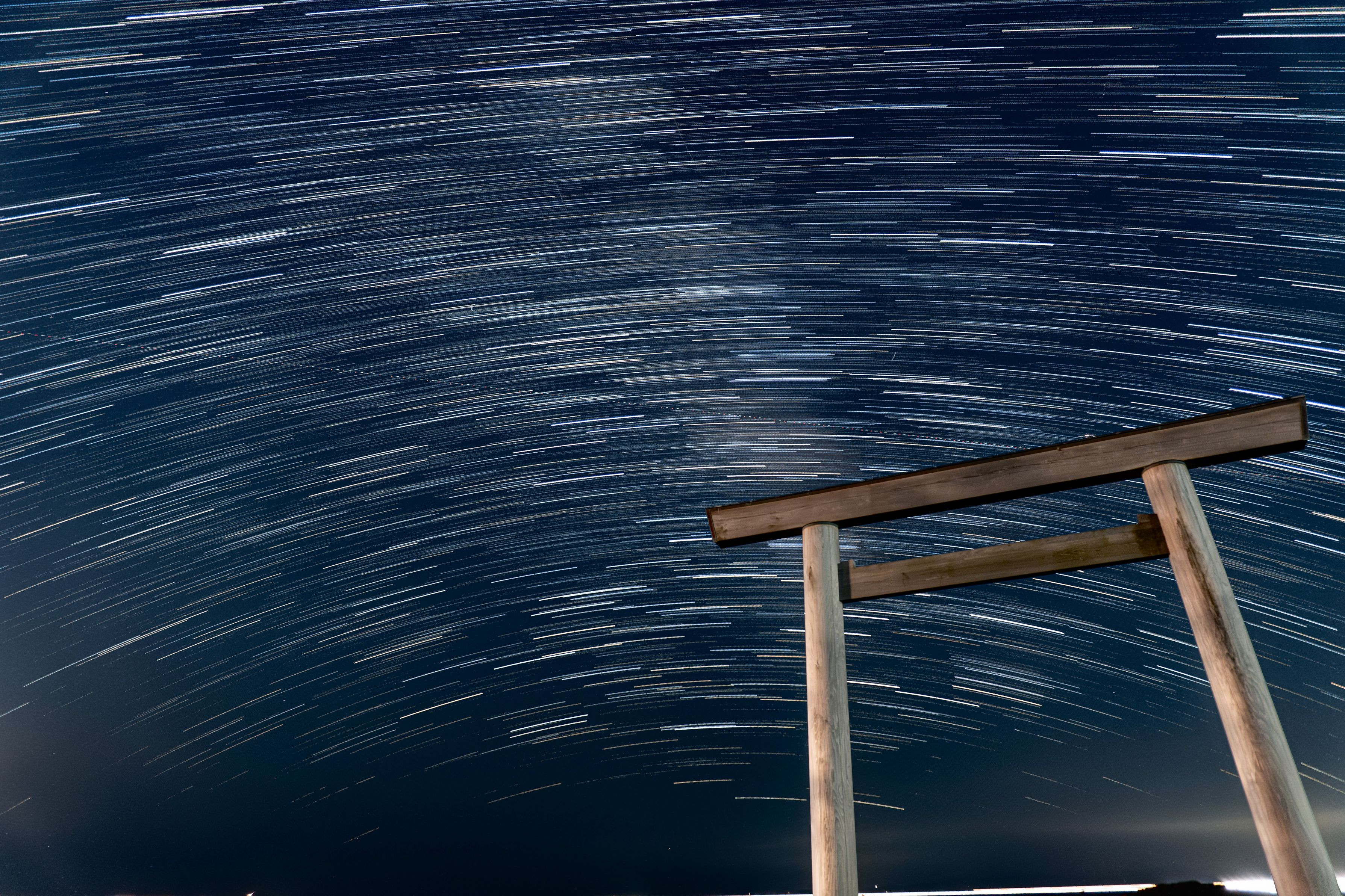 知多半島のつぶて浦にて撮影。 この日は新月で肉眼でも天の川が観測できました。鳥居と星というなかなかみられないコンビネーションを比較明合成で仕上げました。