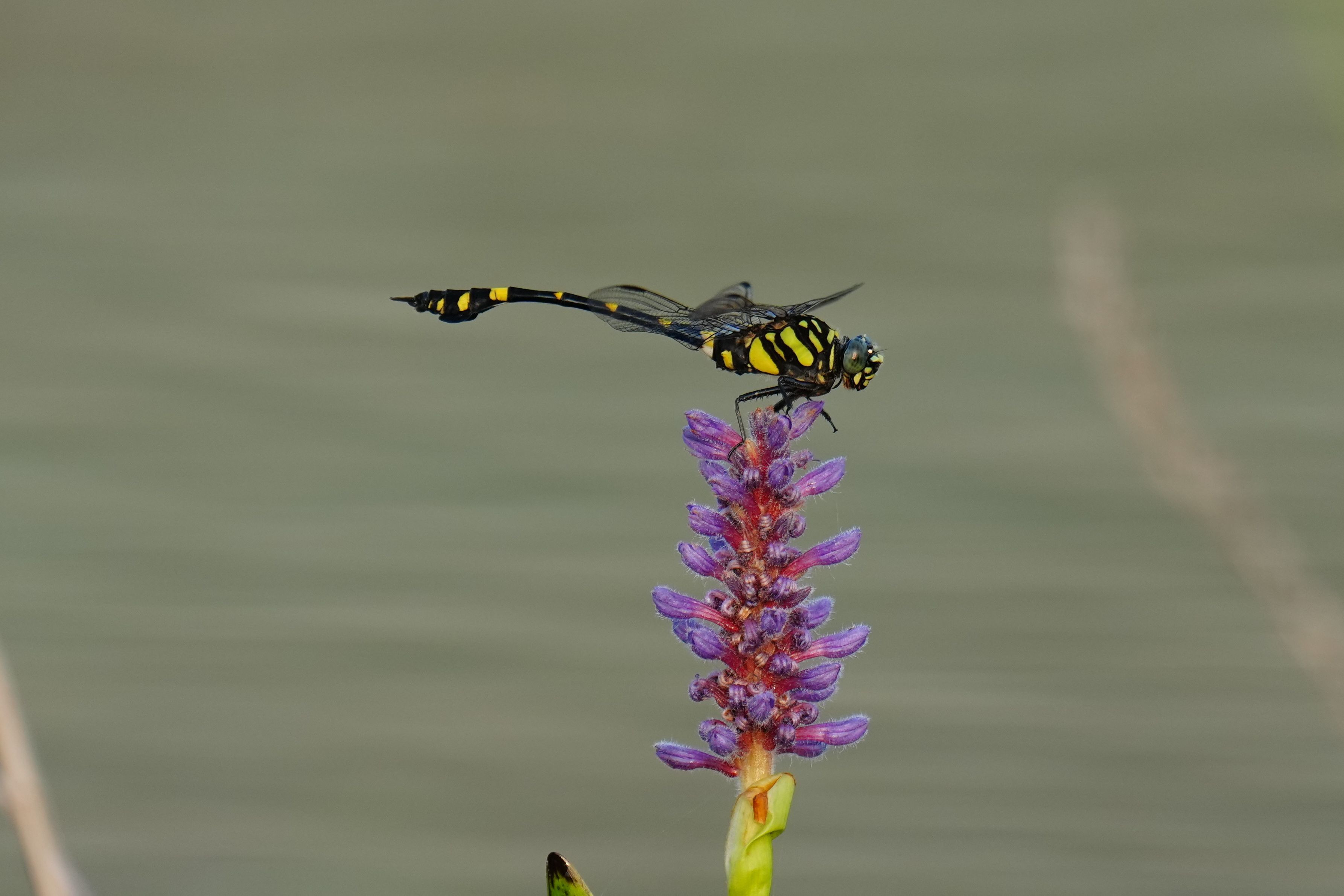 花もトンボも名は知らない。ただ、朝の池端で強烈な個性を振りまいている。