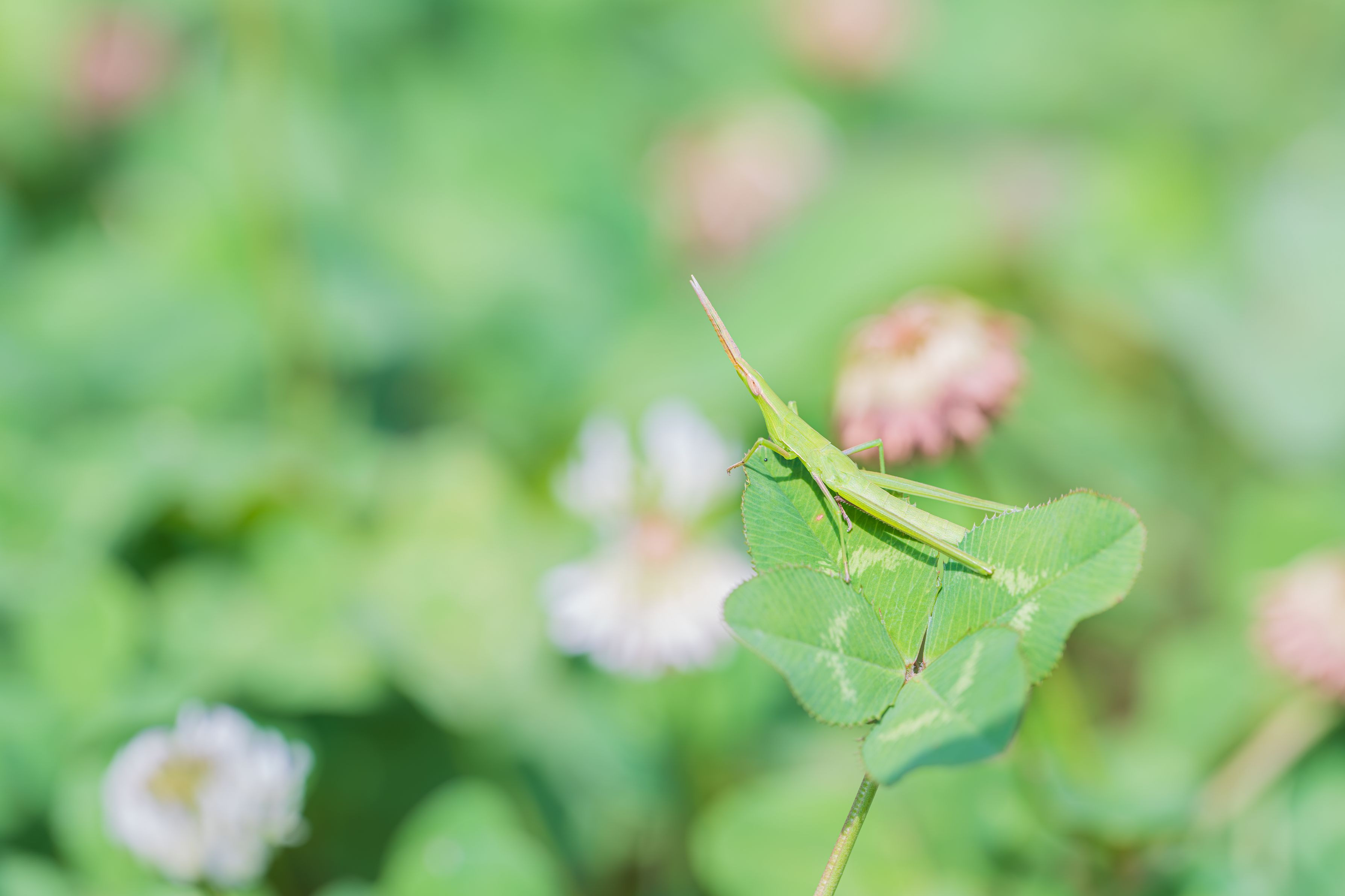 梅雨が明けたんだか明けてないんだかわからないけど、とにかく暑い7月の昼下がり(新潟)。 四つ葉のクローバーに登ったショウリョウバッタの幼虫を見つけました。