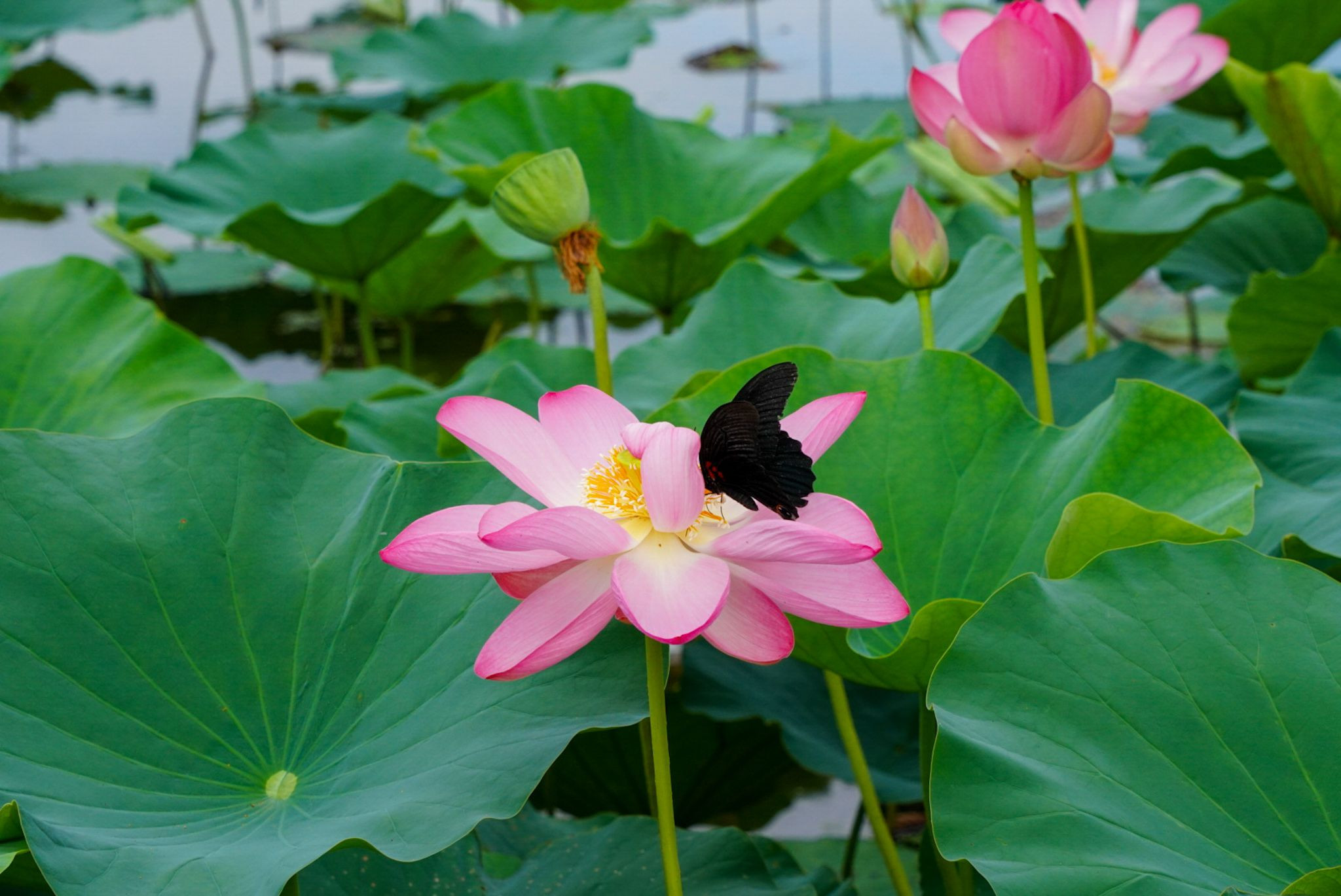 今朝撮りの一枚です クロアゲハが蓮に寄ってきました