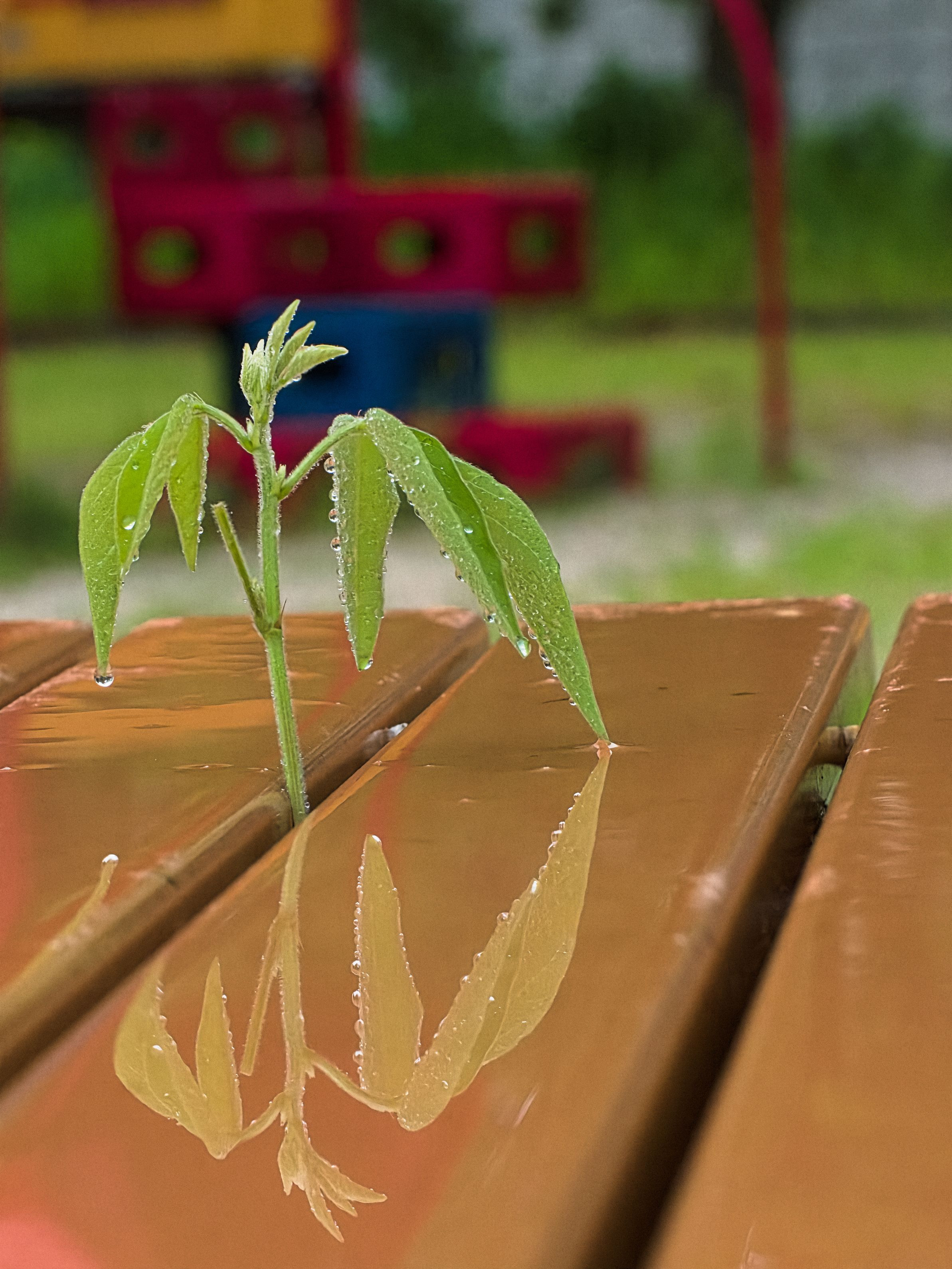 ベンチの隙間から顔を出していたヌスビトハギの葉が雨に濡れたベンチに写し出されまるでバレリーナの様でした