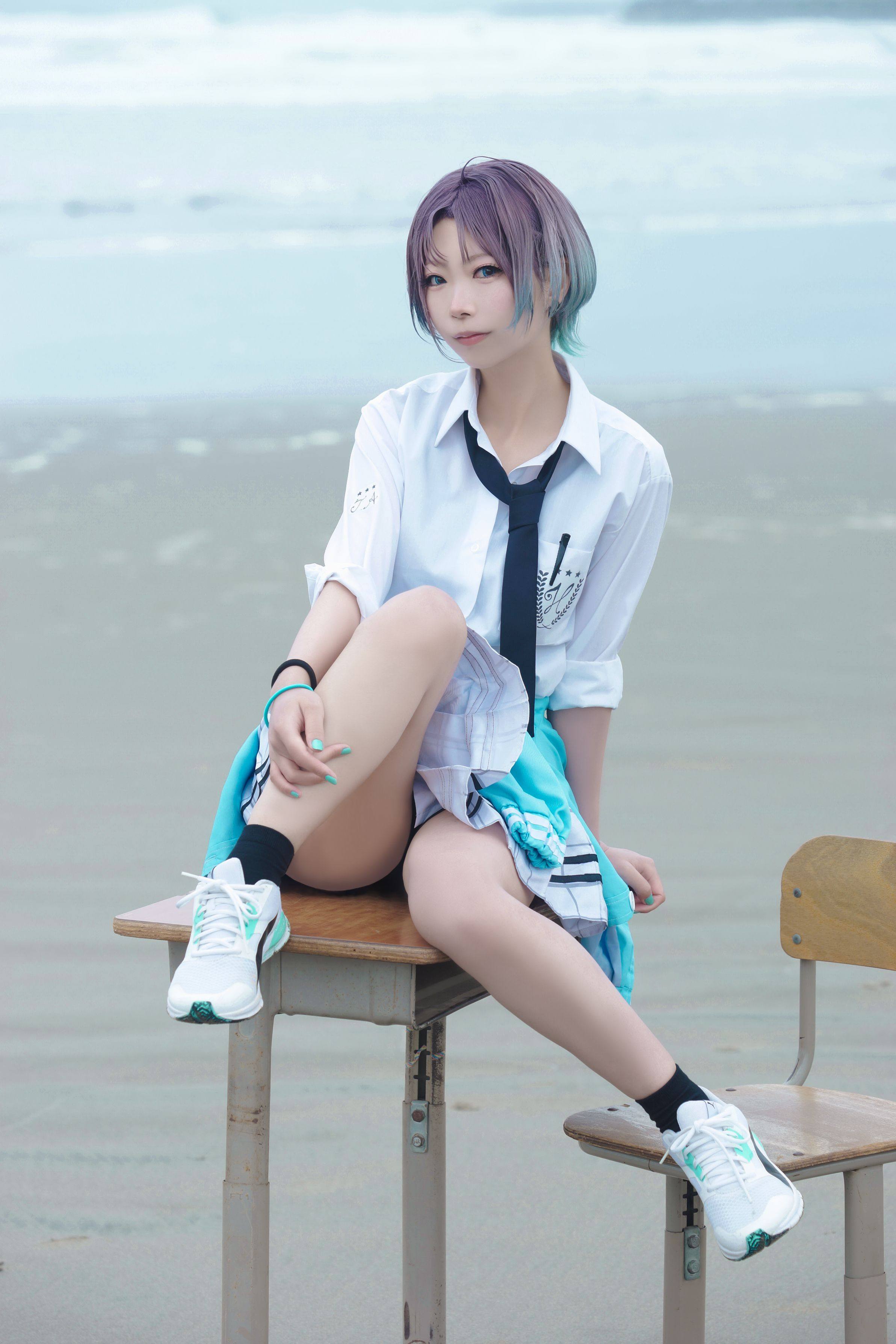 海岸で学校机と椅子持ち込んで撮影しました。