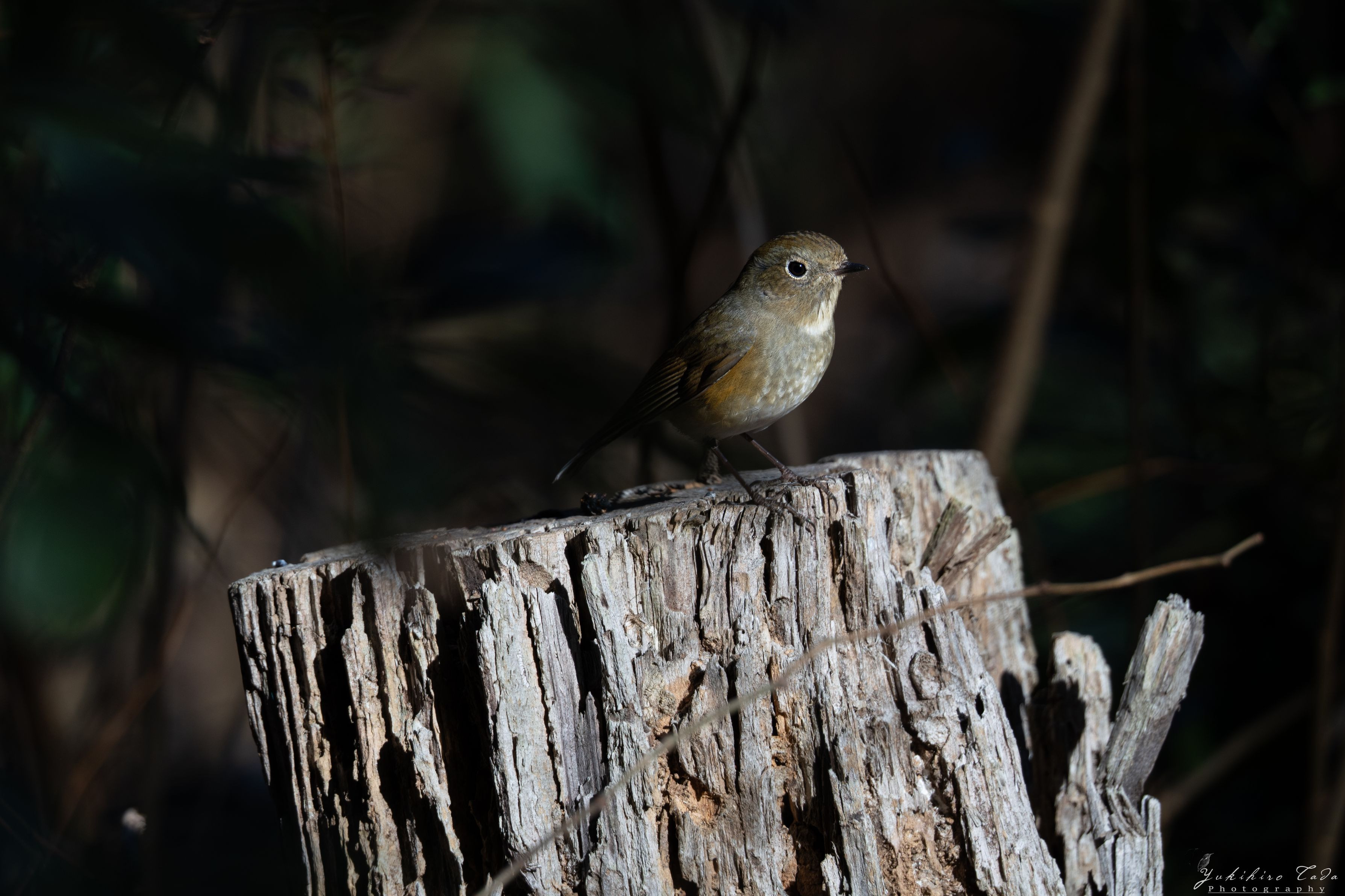 暗闇からひょっこり出てきたルリビタキ雌を捉えた1枚。 木漏れ日が照らしたその表情は可愛くも凛々しい。