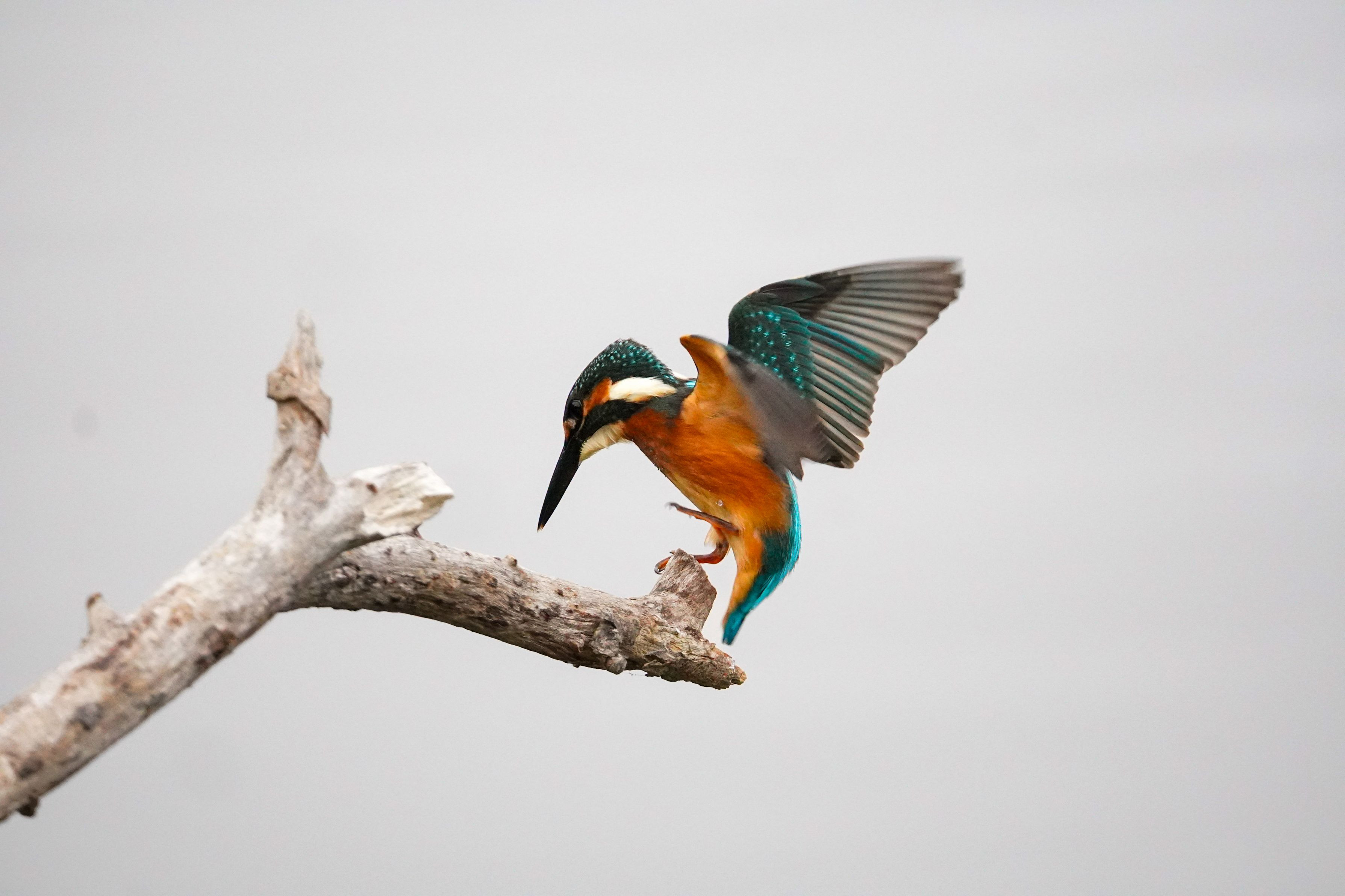 風が強くてバランスを崩しかけたが、羽を広げてバランスをとるカワセミ