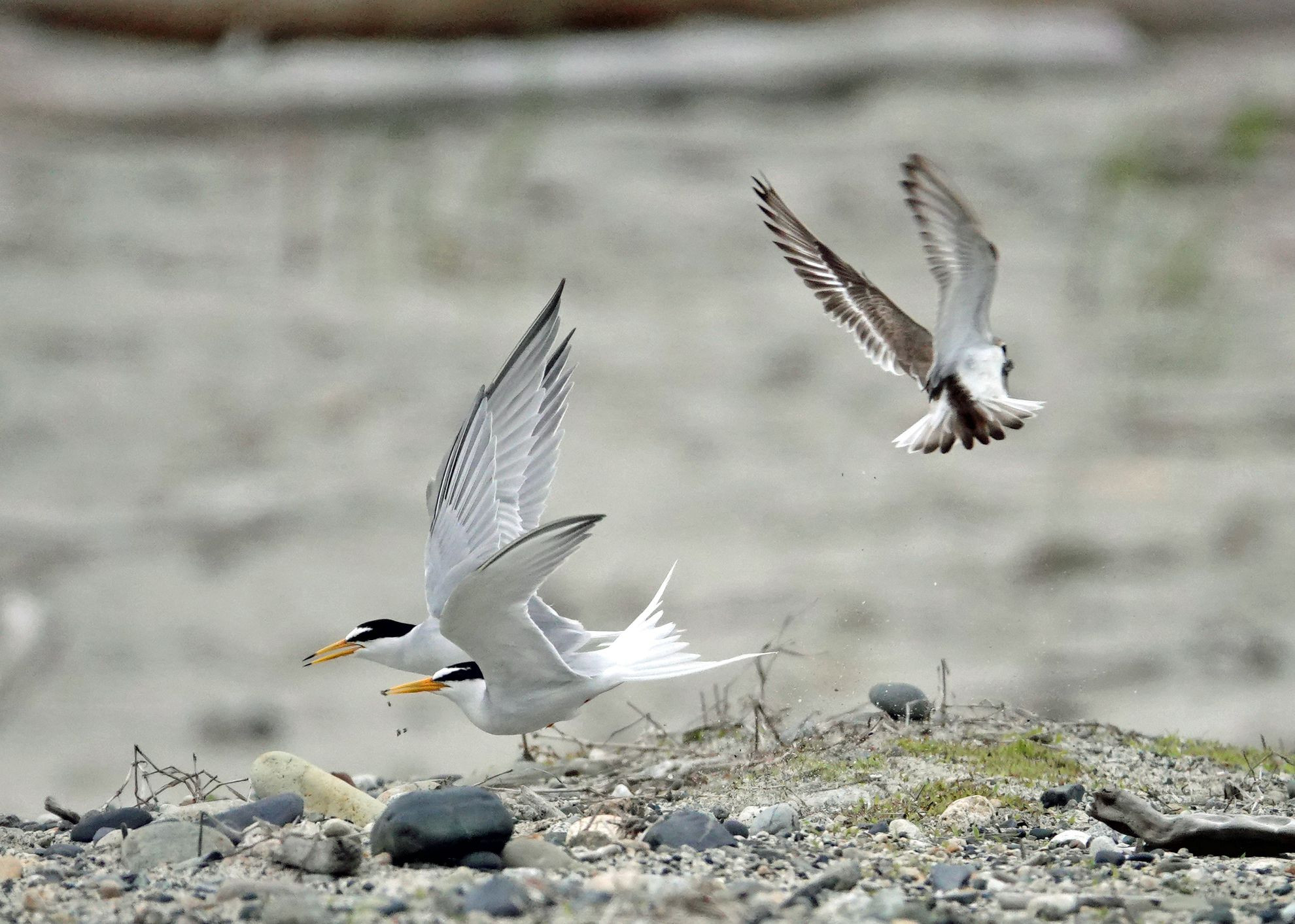 河口の砂礫エリアにコアジサシが飛来したが、同エリアで営巣中のシロチドリに威嚇され飛び立とうとしていた