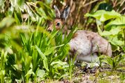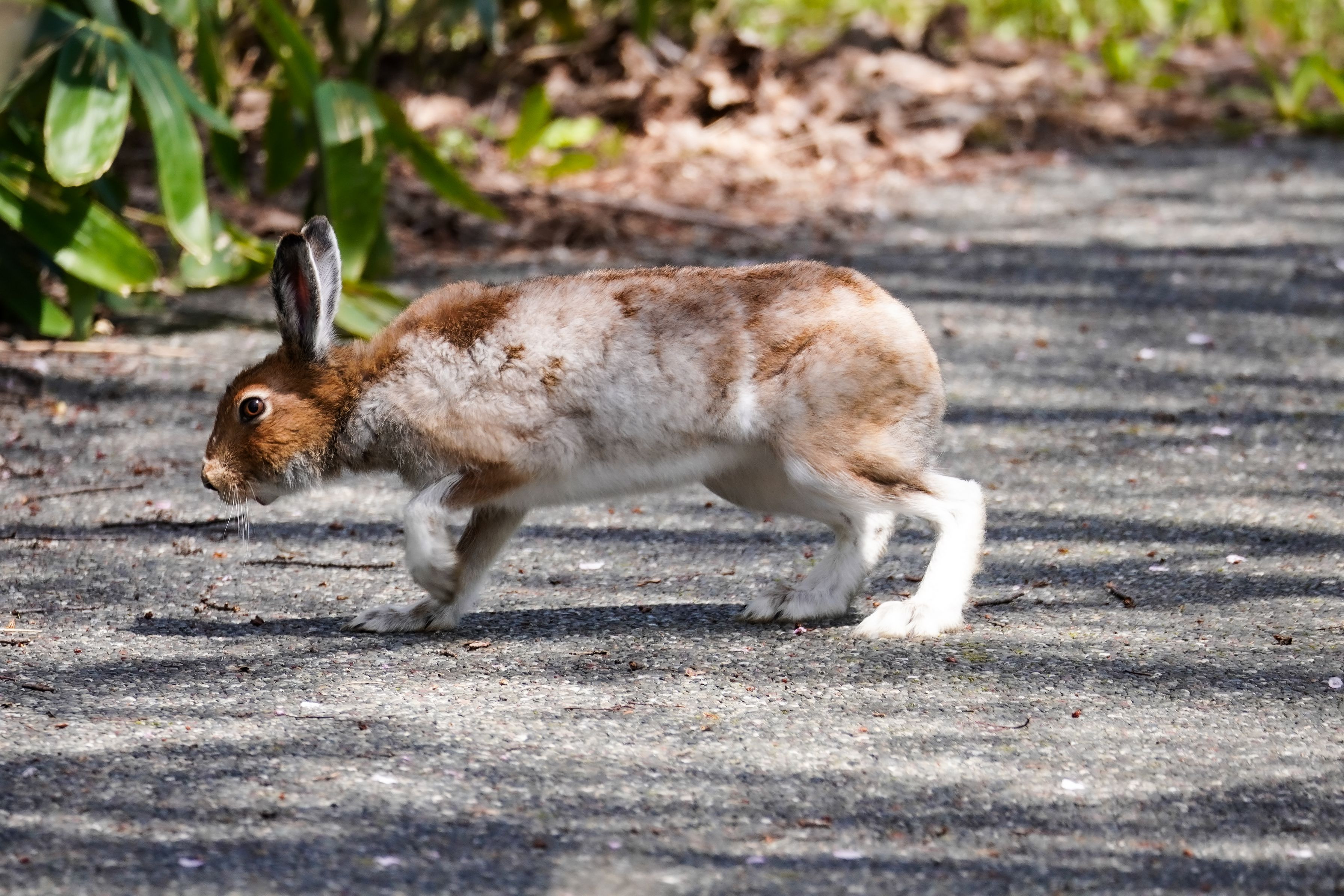 冬は全身真っ白な冬毛になるエゾユキウサギ。 この時期は換毛期で斑になってました。 北海道固有の野ウサギで、国内の哺乳類最速の80km/hで走ります。 餌の少ない冬以外は夜行性で滅多に出会えないのですが、GWの探鳥中にバッタリ。