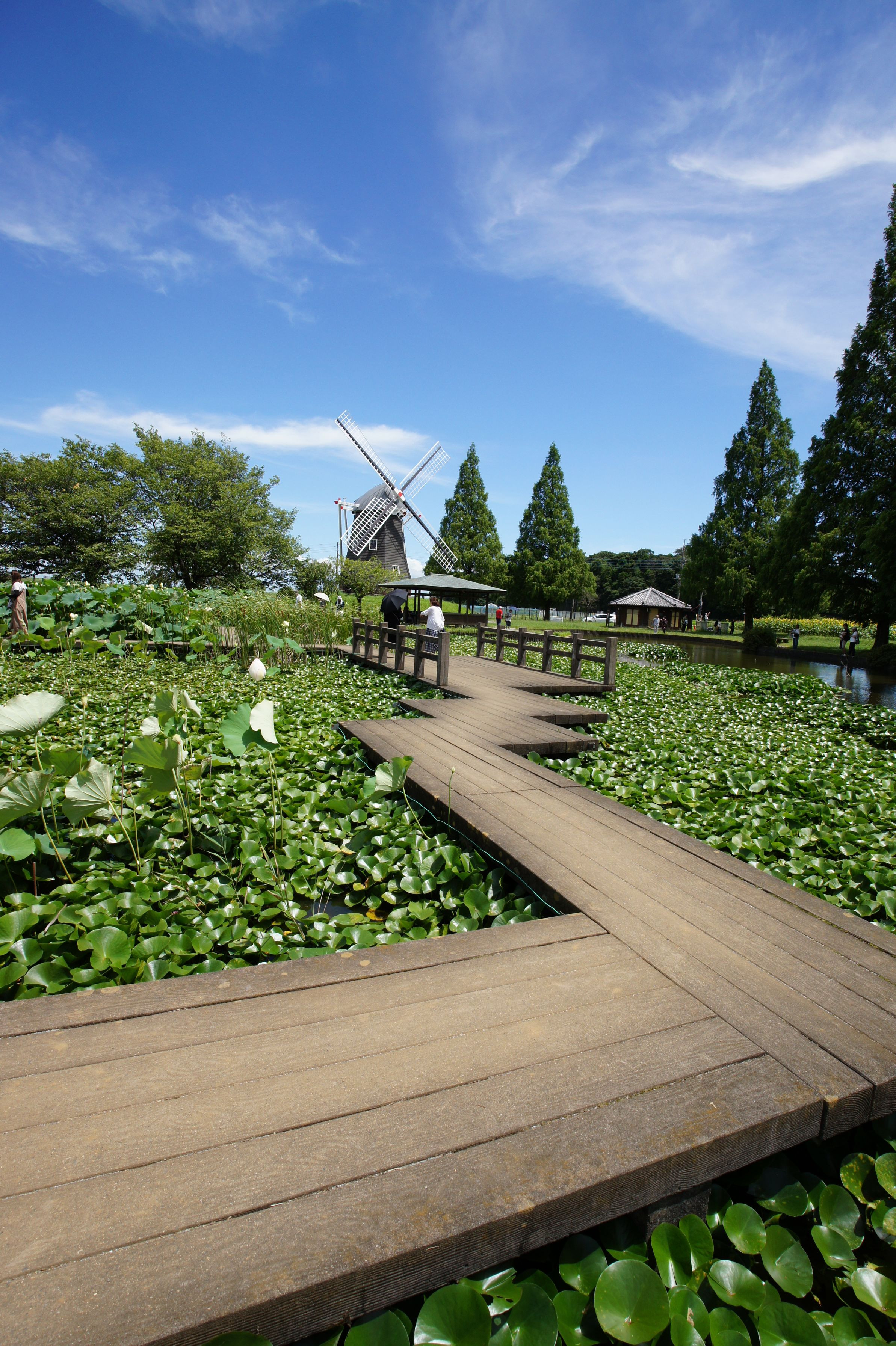 蓮とスイレンの池にかかる木道。