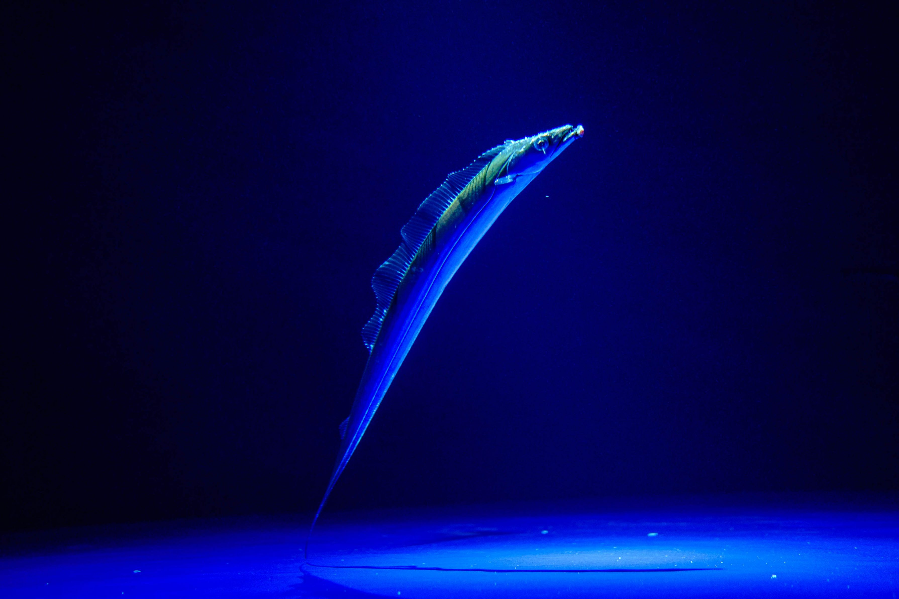 縦に伸びる背びれがまるで龍のうろこ。暗闇を裂いて浮上する一瞬を、F1.4 の被写界深度で“動”を強調しました。