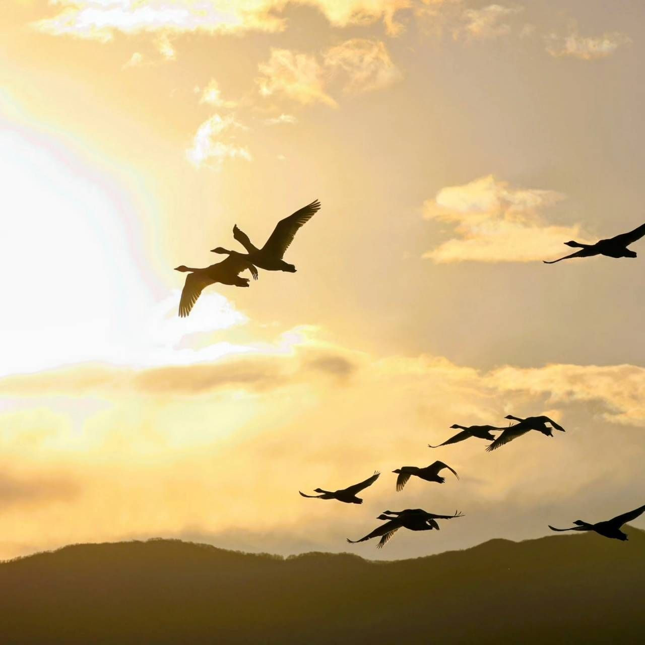 朝日を浴びながら田園への餌場へと一斉に飛び立つ白鳥達の毎朝のルーティン姿