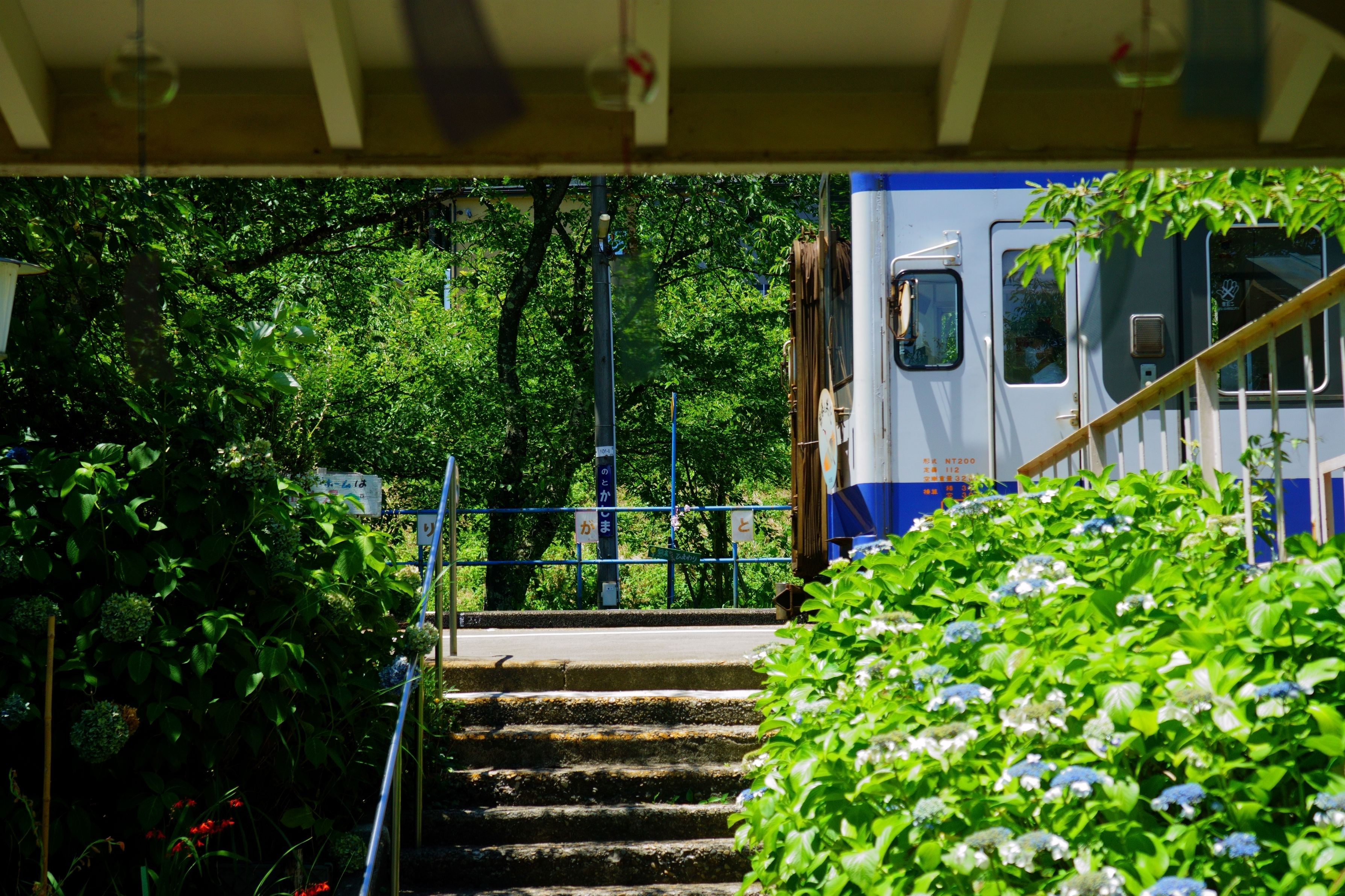 「能登さくら駅」で有名なのと鉄道七尾線能登鹿島駅 地域の方々が沢山のお花を手入れされています 能登鹿島駅へ到着するのと鉄道七尾線NT200型気動車