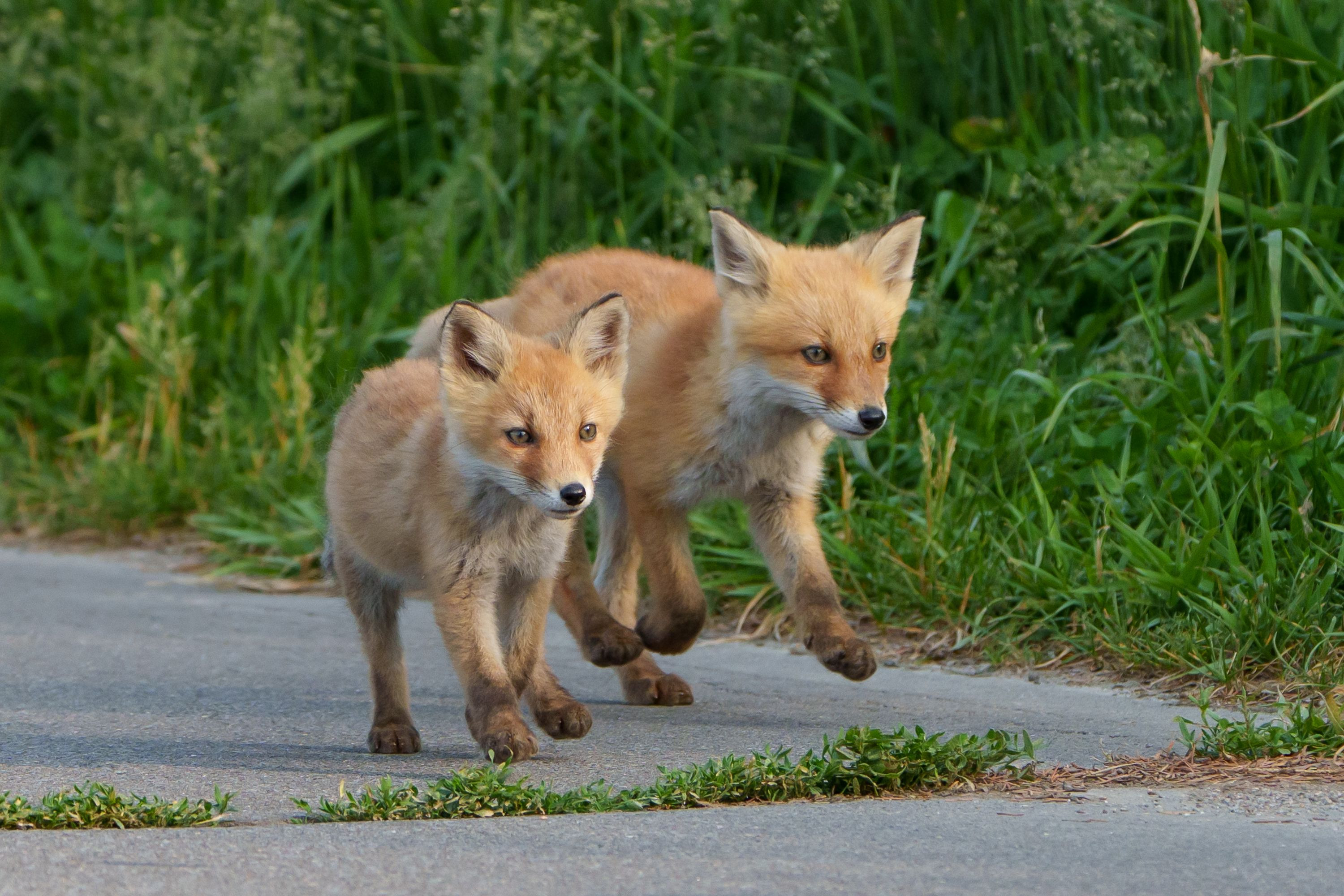 前を歩くお母さんギツネを小走りで追いかける子ギツネたち。 横で撮影しているこちらを見ることなく、お母さんしか見ていない真っ直ぐな視線がとても可愛い。