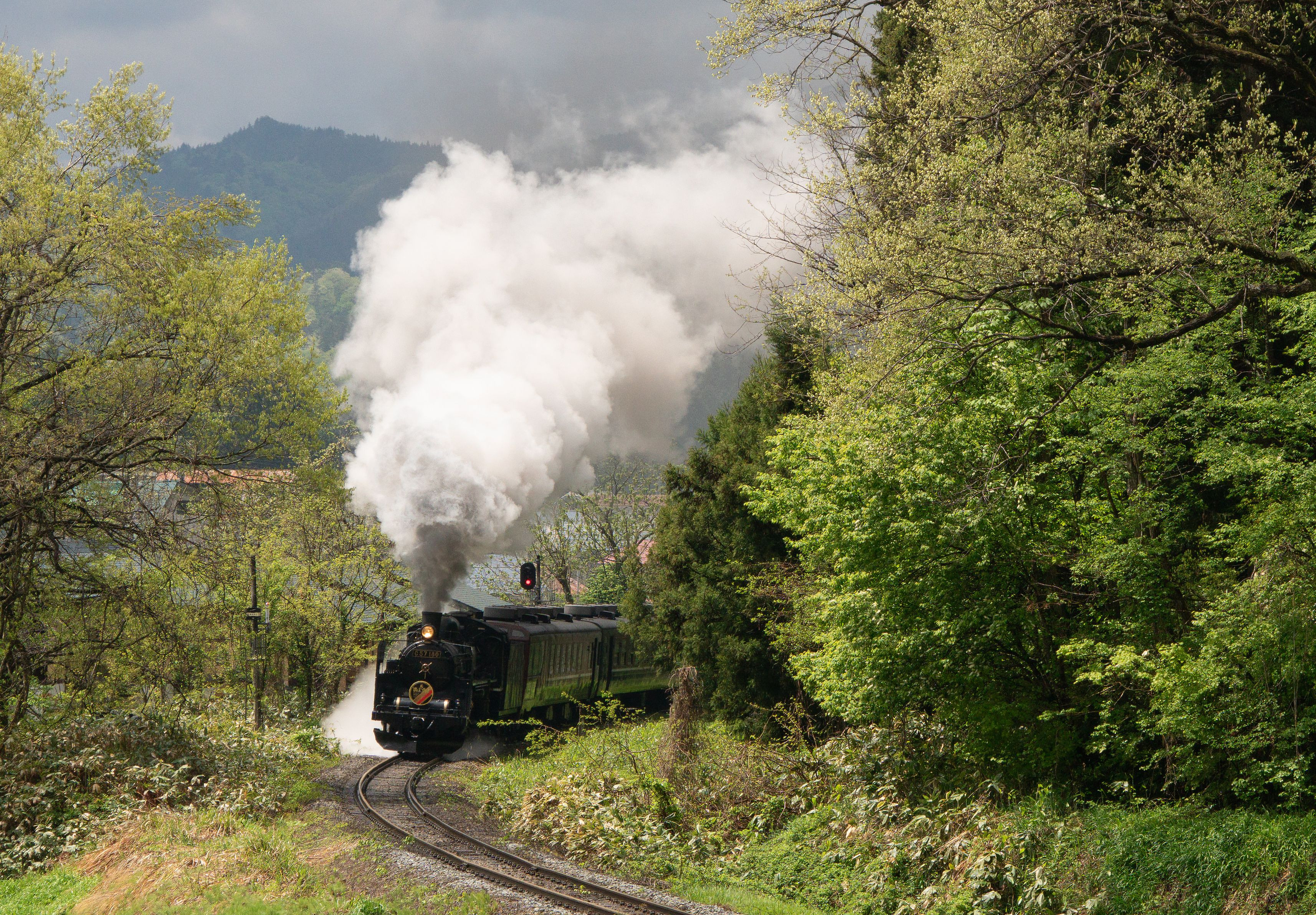 小雨の中、列車が来たほんの何十秒かの間だけ日が差しました。@西会津中学校