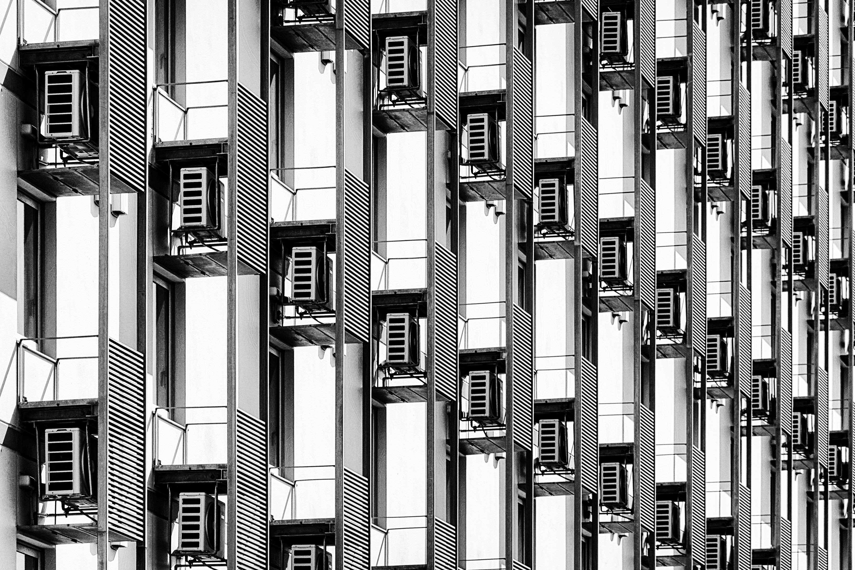 「フル稼働」 整列するエアコン室外機 猛暑の中ではフル稼働! 愛知県常滑市 中部国際空港セントレア前のホテルにて