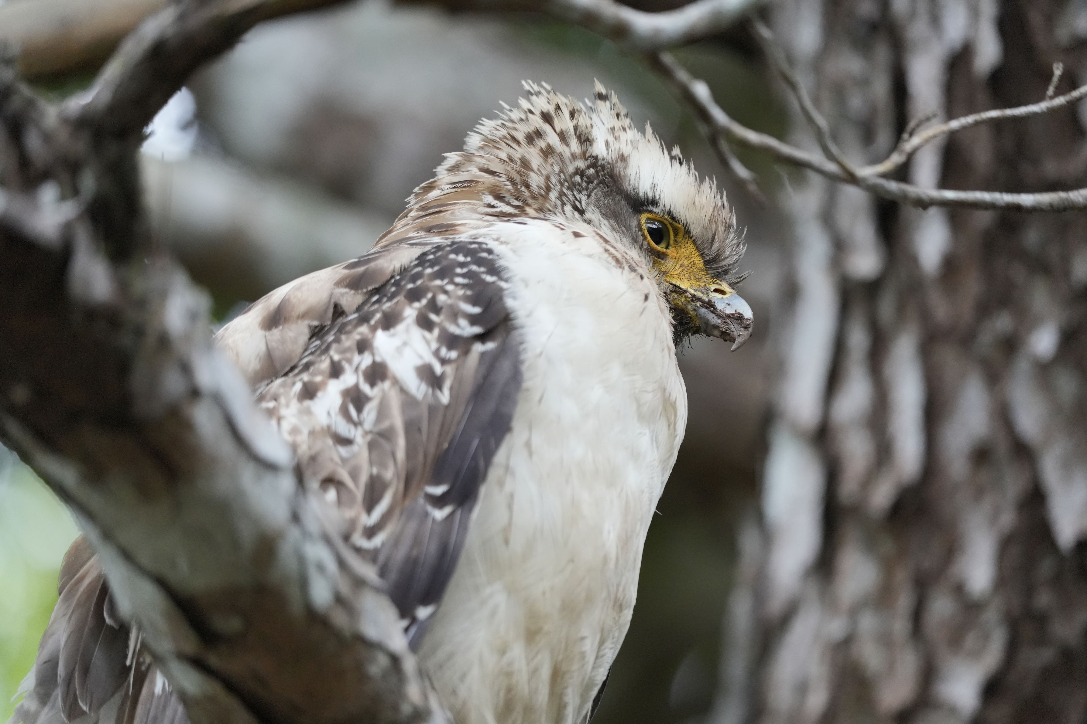野鳥祭2025 今年夏になる前に撮影したカンムリワシの幼鳥。 ナワバリ争いの激しい中、じっとエサとなる小さな虫が動くのを狙っている。 この個体はうまく生存競争を生き延びれなかったそう。 絶滅危惧種。