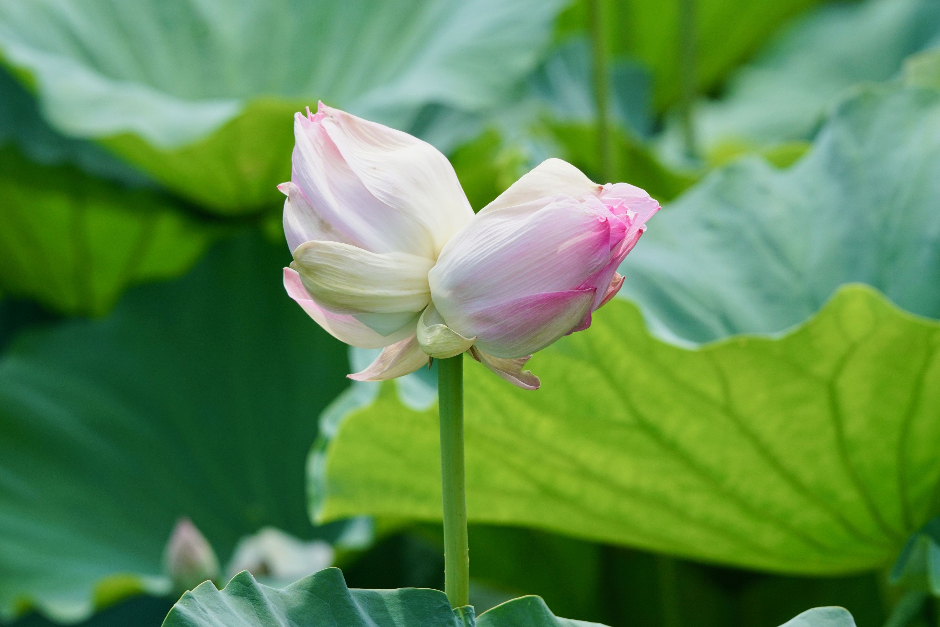 2-3万本に1本と言われる双頭蓮 突然変異だからかな、1茎に2華だからかな、大きく開花しないみたい この状態で開花って地元の新聞に載ってました