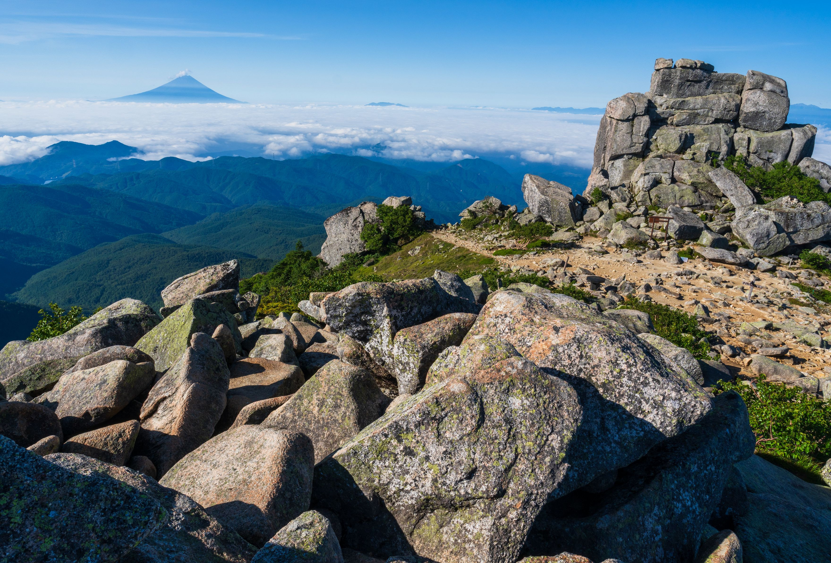 金峰山からの展望 雲海に浮かぶ富士山と金峰山の五丈岩