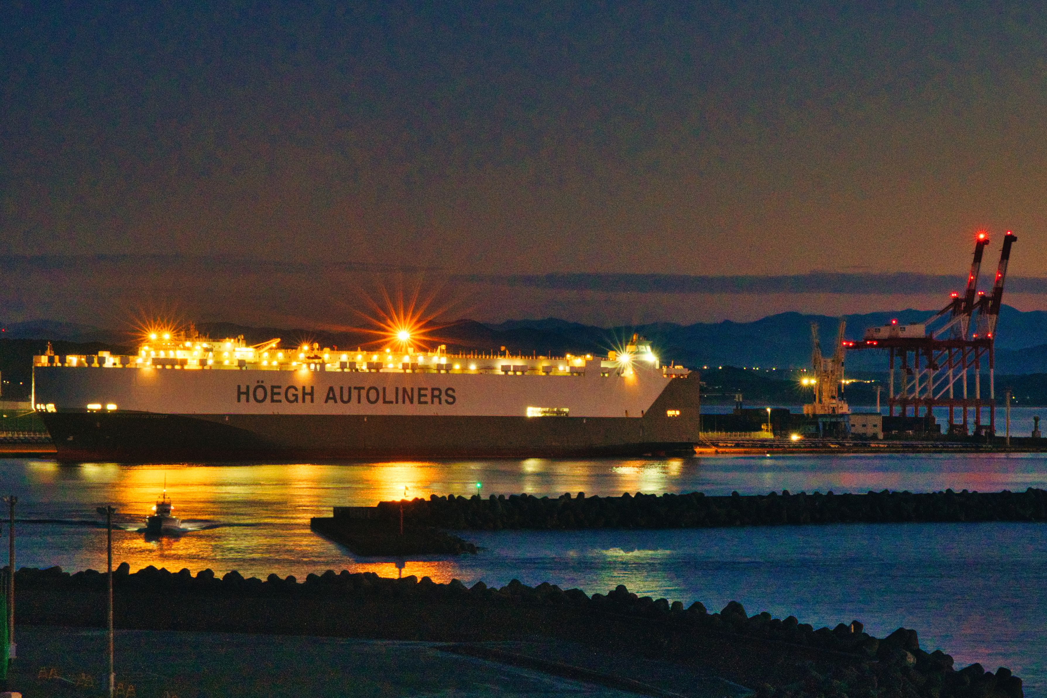 夜明け前の港。 大型貨物船が作業中なのか明かりを灯して停泊。 手前に漁船が出港していきます。
