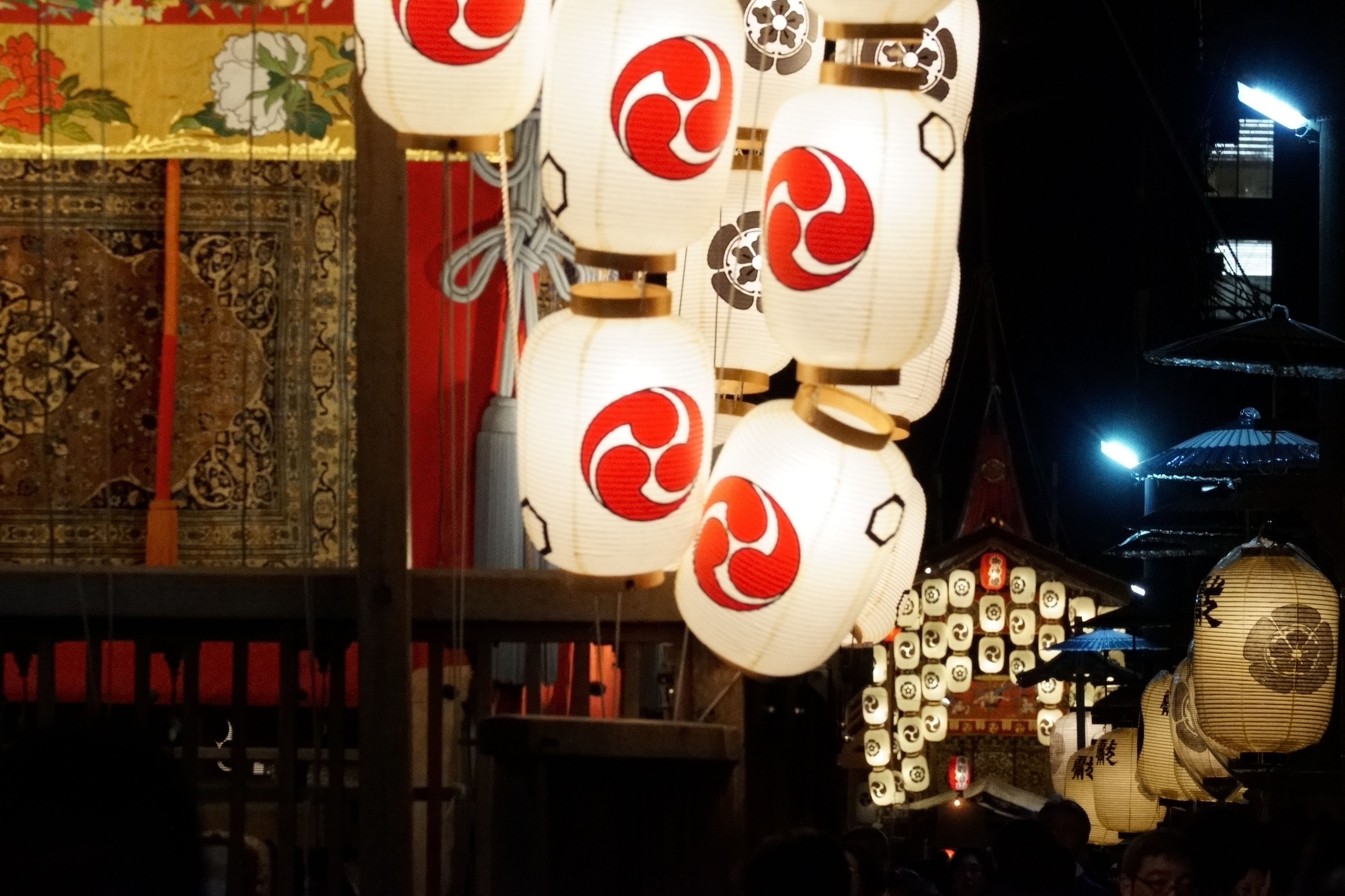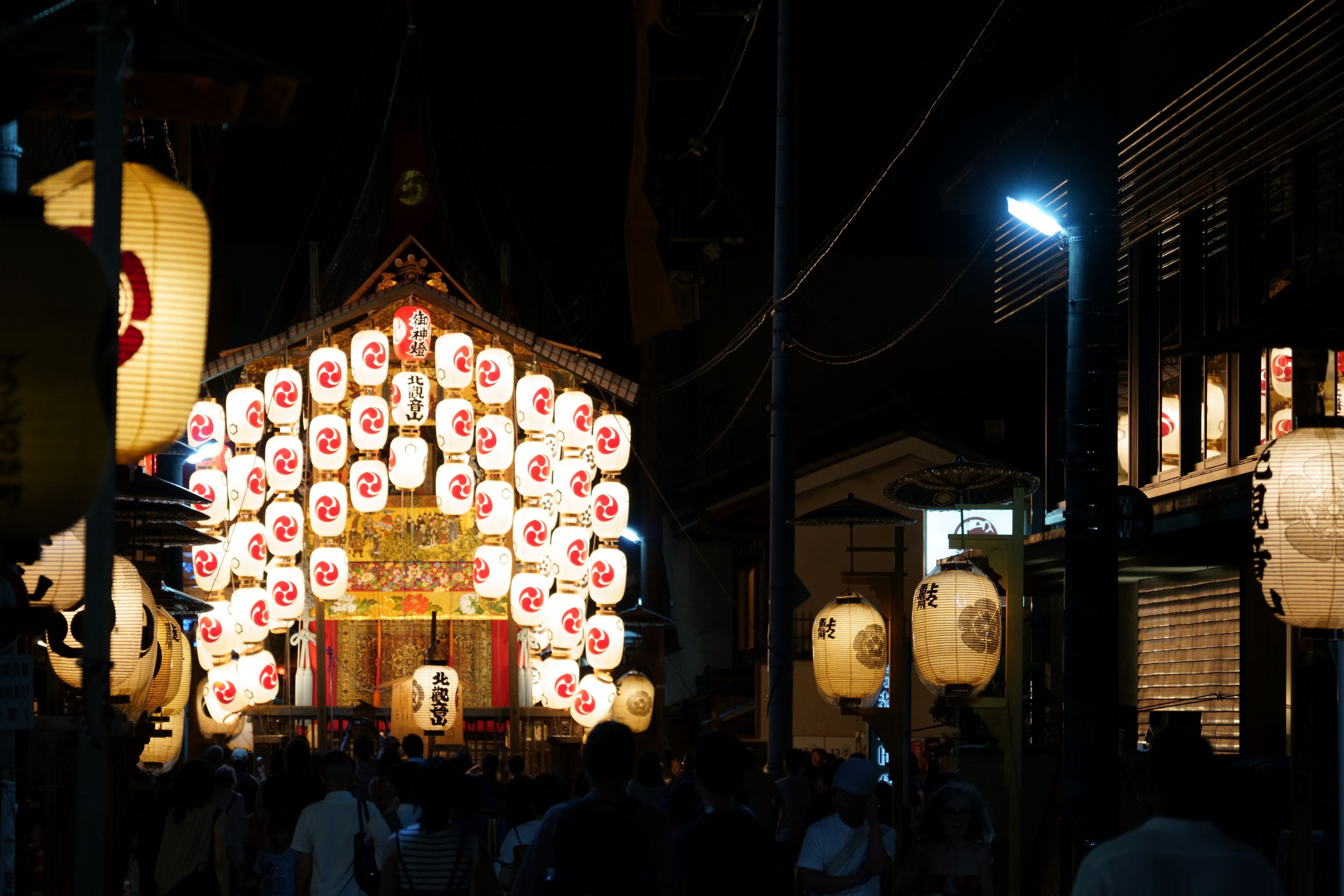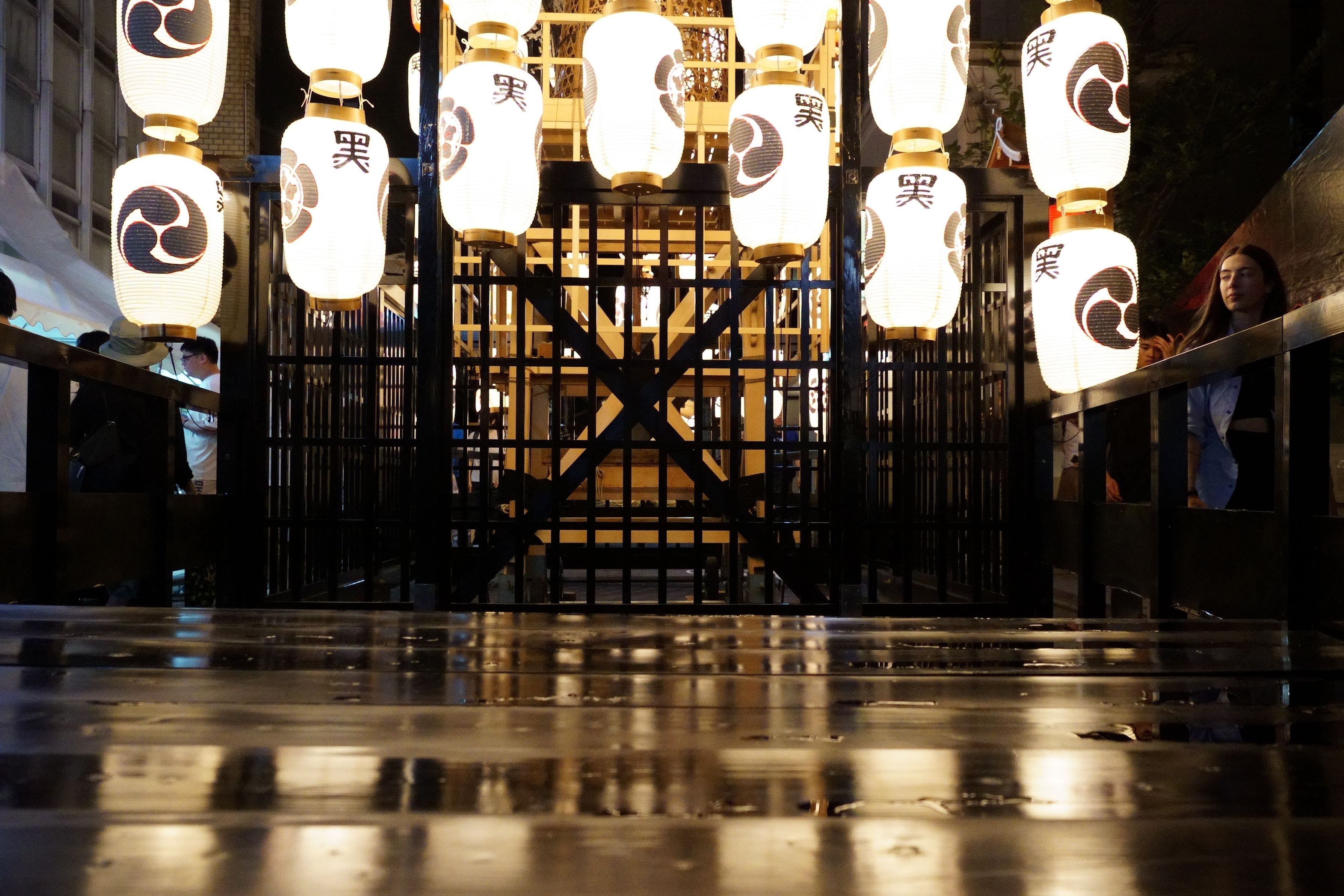 遠くに鯉山の明かりが見えますが、家族連れ数人がその前で立ち止まり目立っていたので、しばらく待つことに。なかなか立ち去らない間に、もう一つの目障りだった電飾の大きな看板が突然消灯。幸運でした
