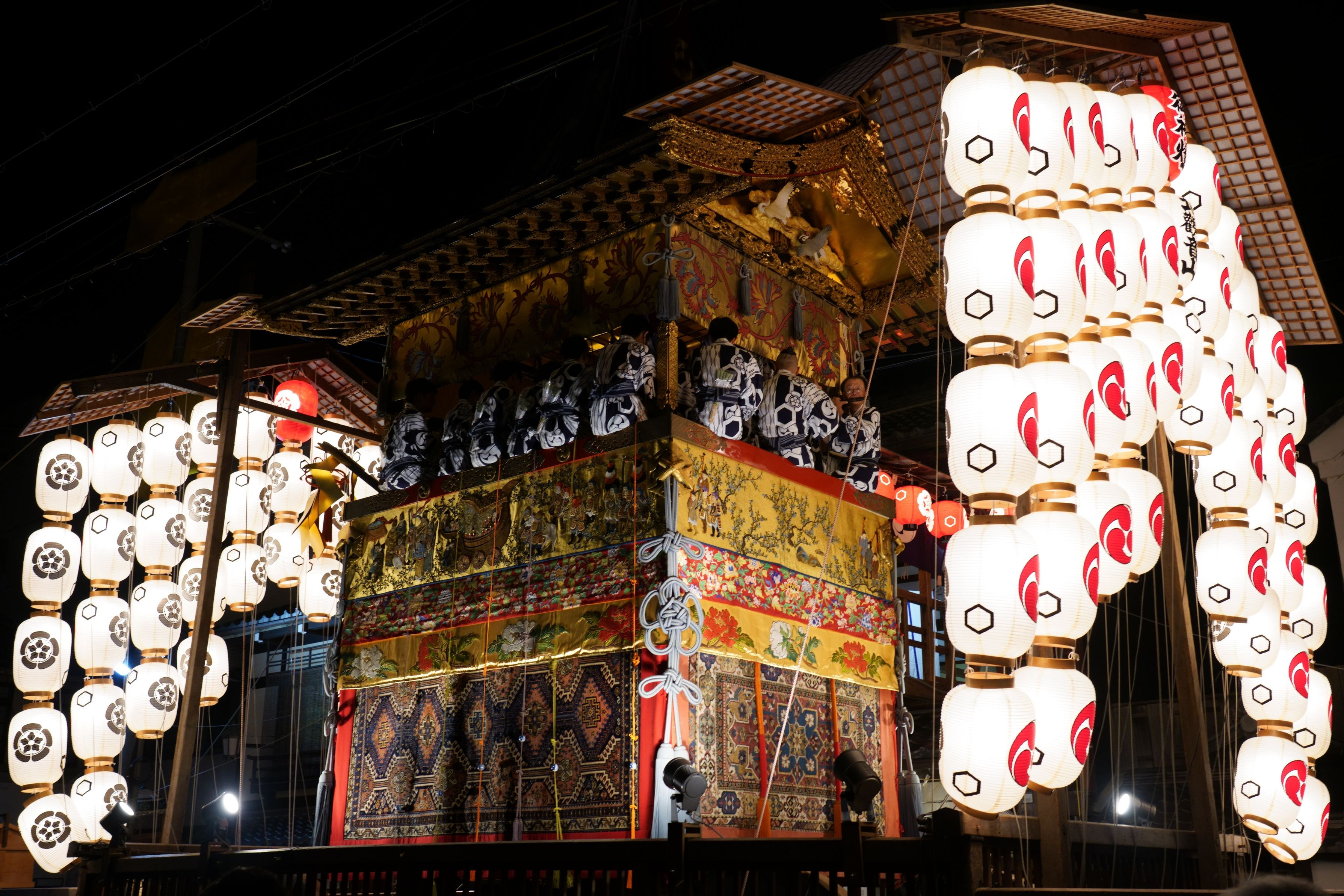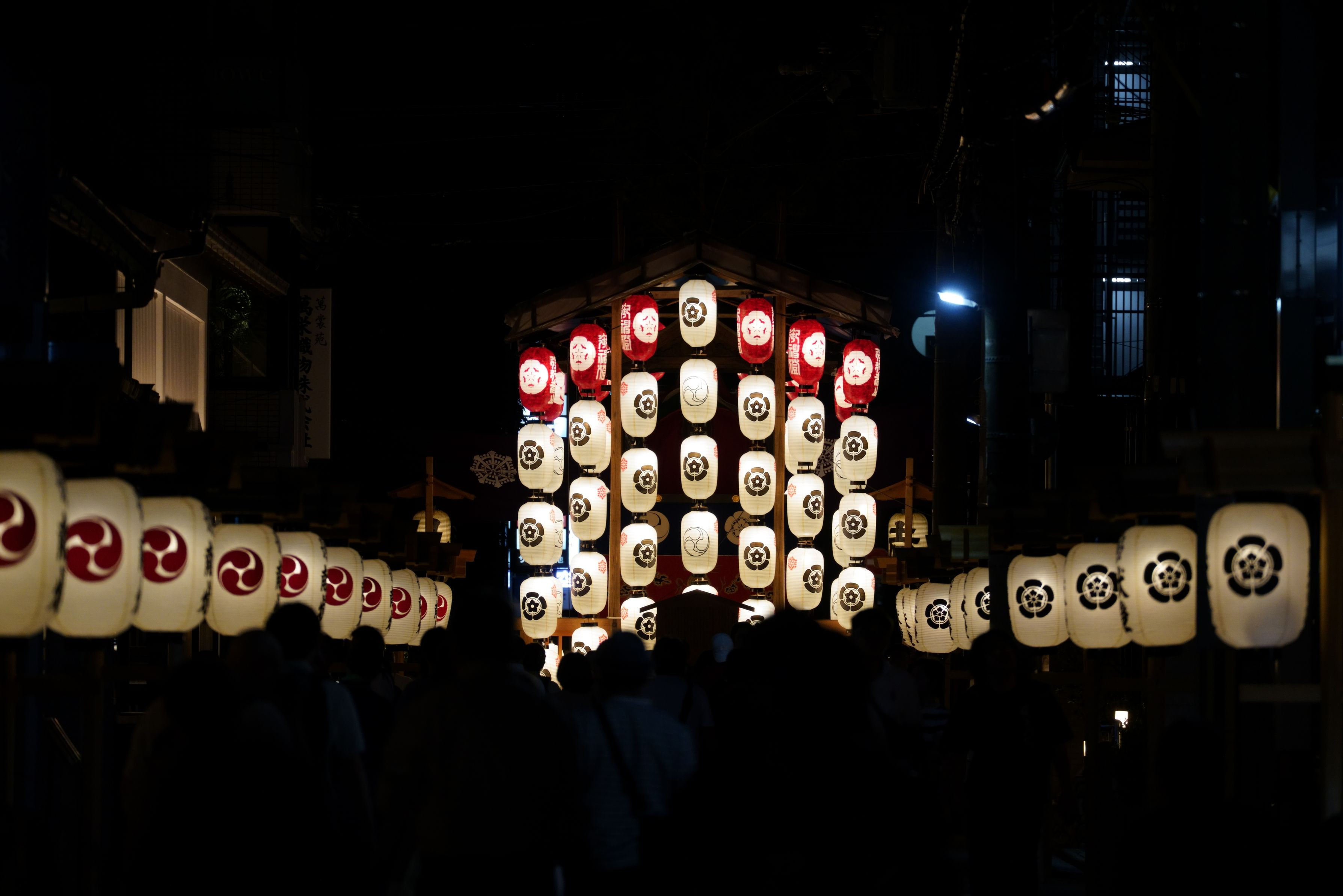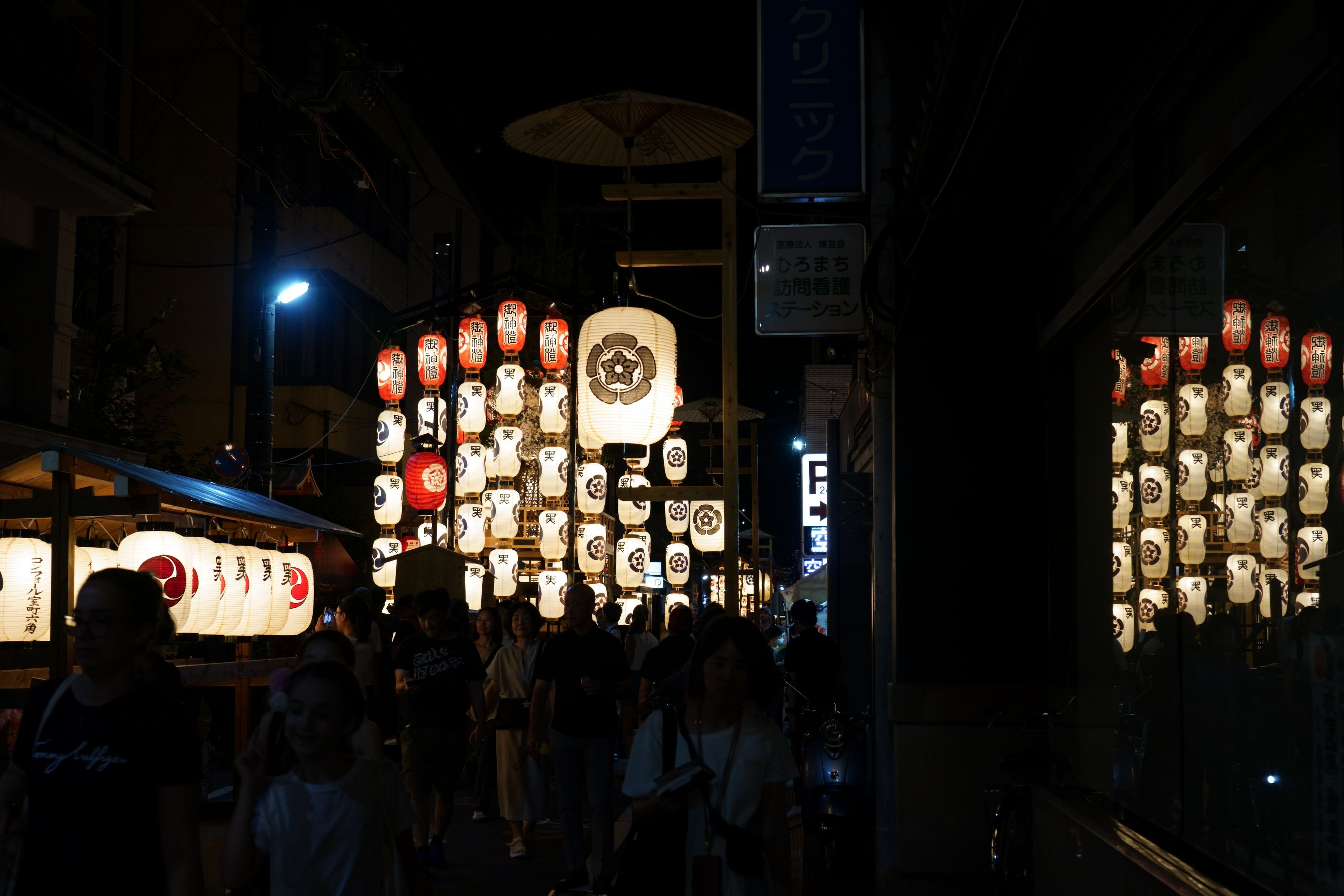遠くに鯉山の明かりが見えますが、家族連れ数人がその前で立ち止まり目立っていたので、しばらく待つことに。なかなか立ち去らない間に、もう一つの目障りだった電飾の大きな看板が突然消灯。幸運でした