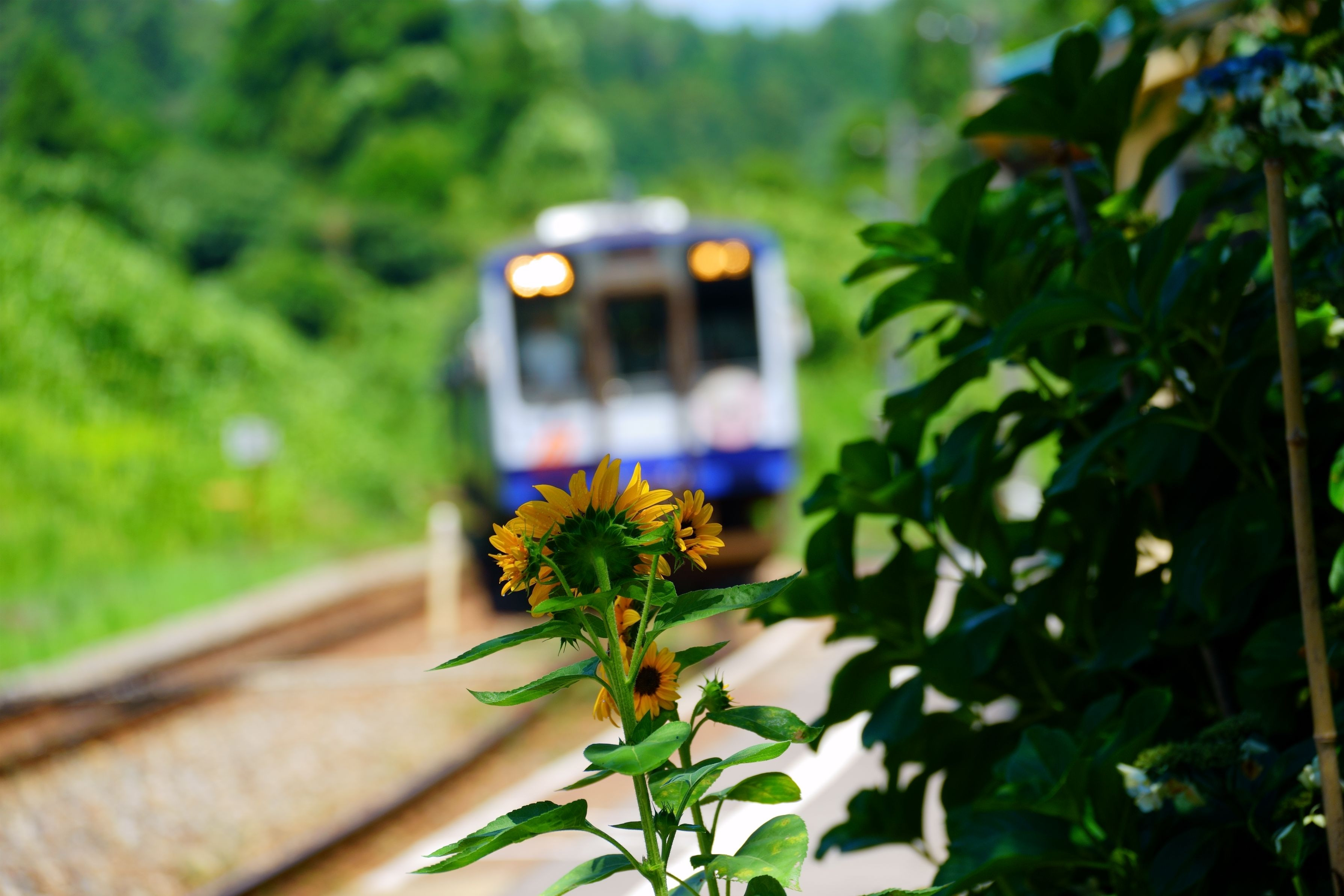 36℃超えの能登さくら駅(能登鹿島駅)にひまわりのお出迎えを受けるのと鉄道七尾線列車。 この列車2~3両目は「震災語り部観光列車」として(里山号、里海号)を増結しています。