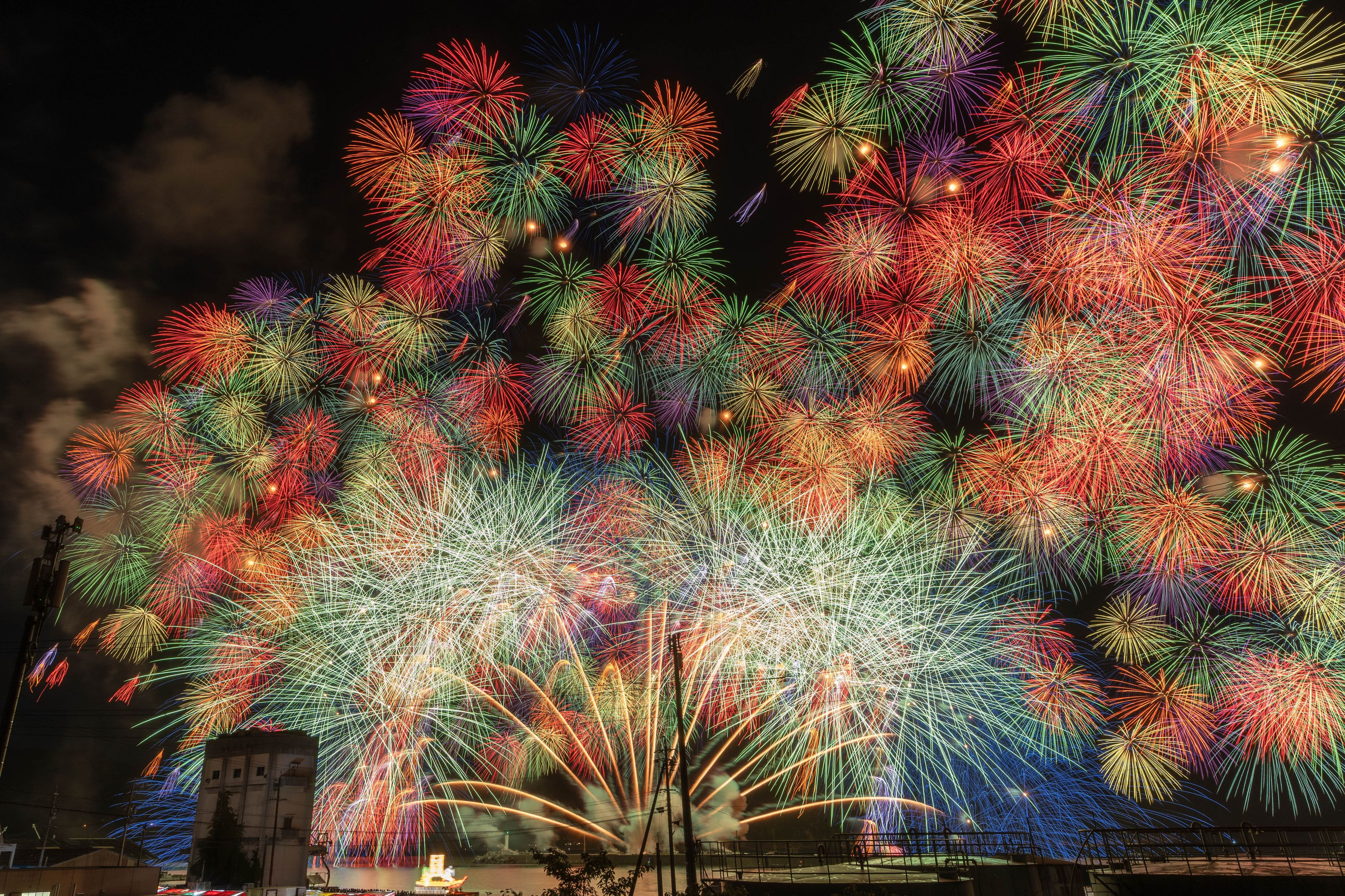 出遅れました、どこもかも映えスポットはすべて場所取り済み、かろうじて見通せる場所からスターマインをパチリ