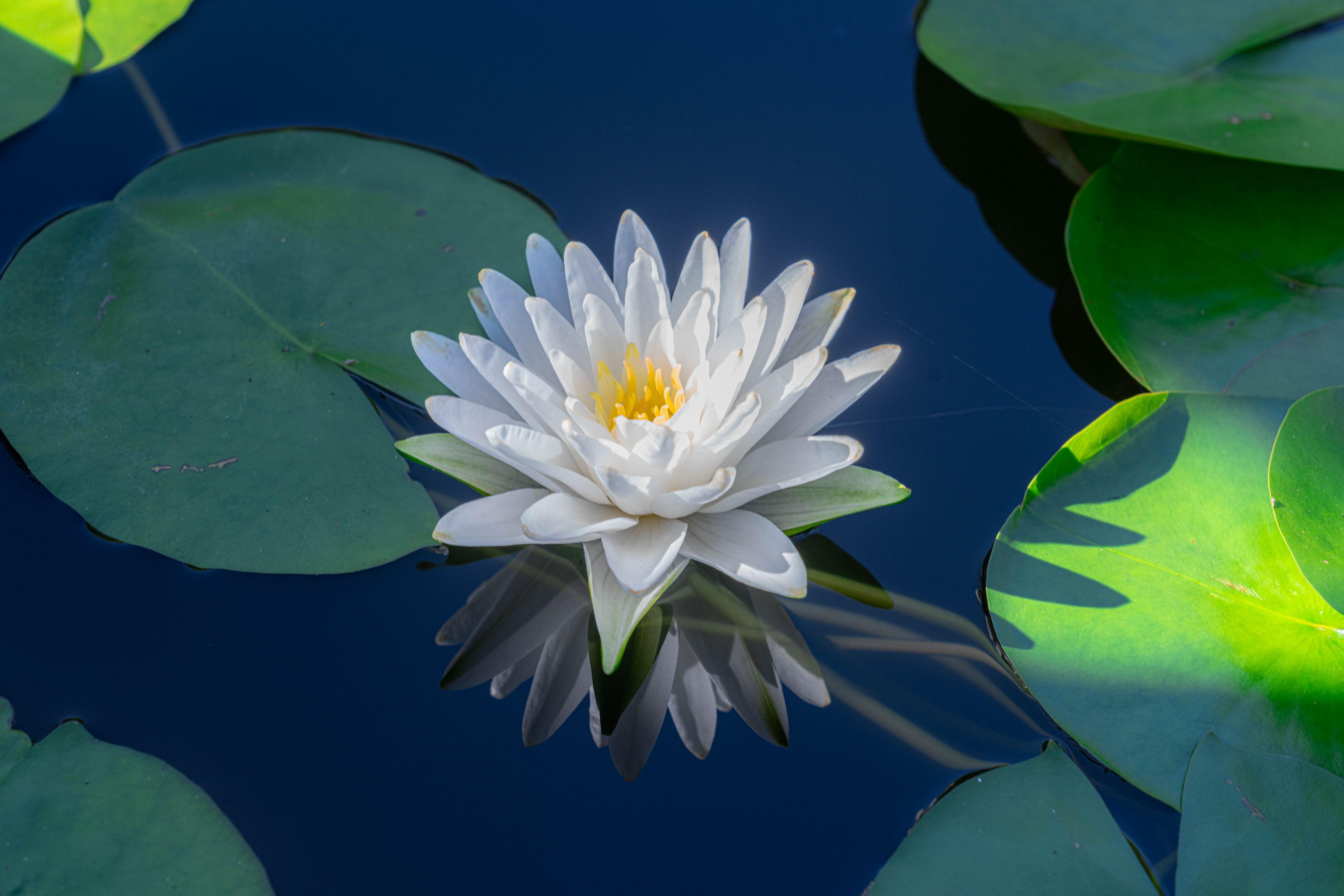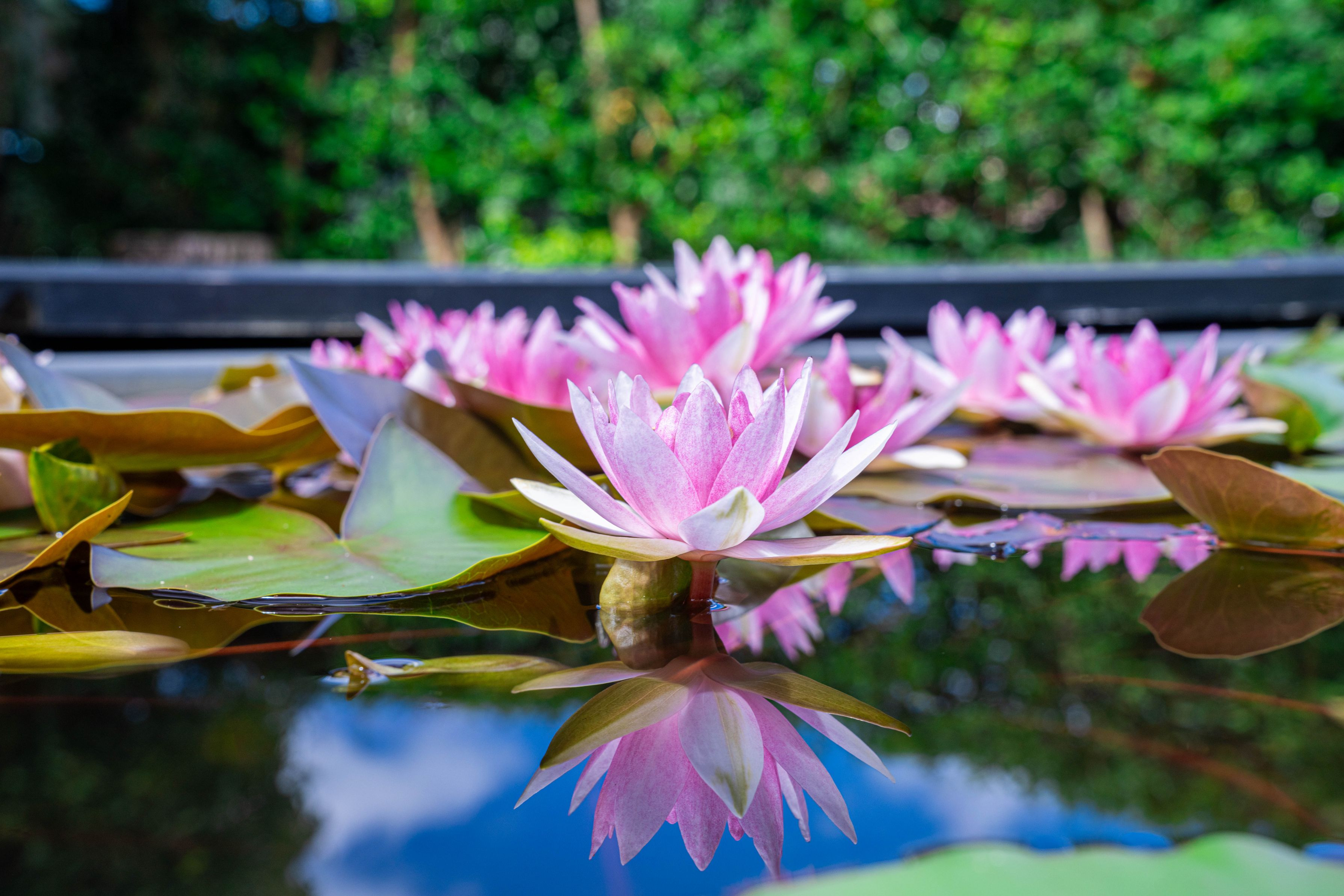 青空の下、とても暑かったですが睡蓮が今年も綺麗に咲いていました。